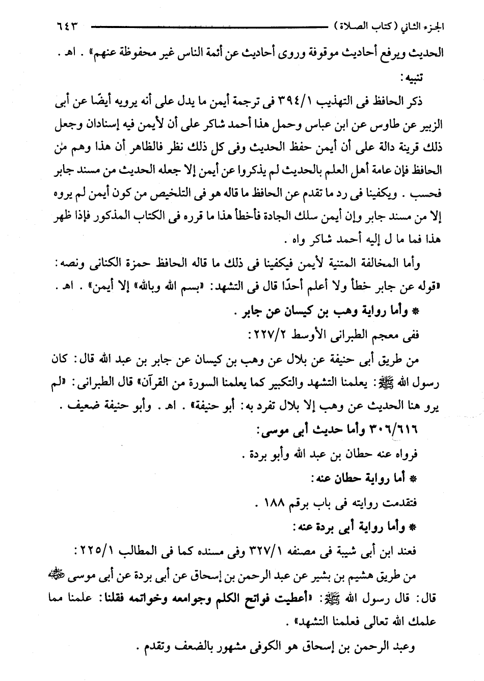 من طريق أبى حنيفة عن بلال عن وهب بن كيسان عن جابر بن عبد الله قال: كان رسول الله - صلى الله عليه وسلم -: يعلمنا التشهد والتكبير كما يعلمنا السورة من القرآن" قال الطبراني: "لم يرو هنا الحديث عن وهب إلا بلال تفرد به: أبو حنيفة". اهـ. وأبو حنيفة ضعيف.
