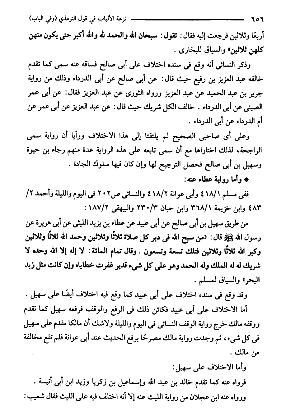 من طريق سهيل بن أبى صالح عن أبى عبيد عن عطاء بن يزيد الليثي عن أبى هريرة عن رسول الله - صلى الله عليه وسلم - قال: "من سبح الله في دبر كلّ صلاة ثلاثًا وثلاثين وحمد الله ثلاثًا وثلاثين وكبر الله ثلاثًا وثلاثين فتلك تسعة وتسعون. وقال تمام المائة: لا اله إلا الله وحده لا شريك له له الملك وله الحمد وهو على كل شىء قدير غفرت خطاياه وإن كانت مثل زبد البحر" والسياق لمسلم.