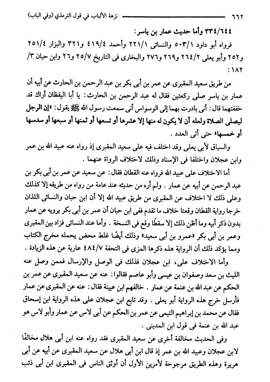 من طريق سعيد المقبرى عن عمر بن أبى بكر بن عبد الرحمن بن الحارث عن أبيه أن عمار بن ياسر صلى ركعتين فقال له عبد الرحمن بن الحارث: يا أبا اليقظان أراك قد خففتهما قال: أنى بادرت بهما إلى الوسواس أنى سمعت رسول الله - صلى الله عليه وسلم - يقول: "إن الرجل ليصلى الصلاة ولعله أن لا يكون له منها إلا عشرها أو تسعها أو ثمنها أو صبعها أو سدسها أو خمسها" حتى أتى العدد.
