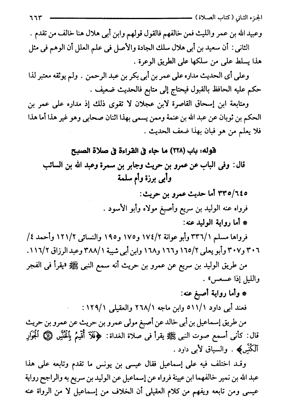 من طريق إسماعيل بن أبى خالد عن أصبغ مولى عمرو بن حريث عن عمرو بن حريث قال: كأنى أسمع صوت النبي - صلى الله عليه وسلم - يقرأ في صلاة الغداة: {فَلَا أُقْسِمُ بِالْخُنَّسِ (15) الْجَوَارِ الْكُنَّسِ}. والسياق لأبى داود.