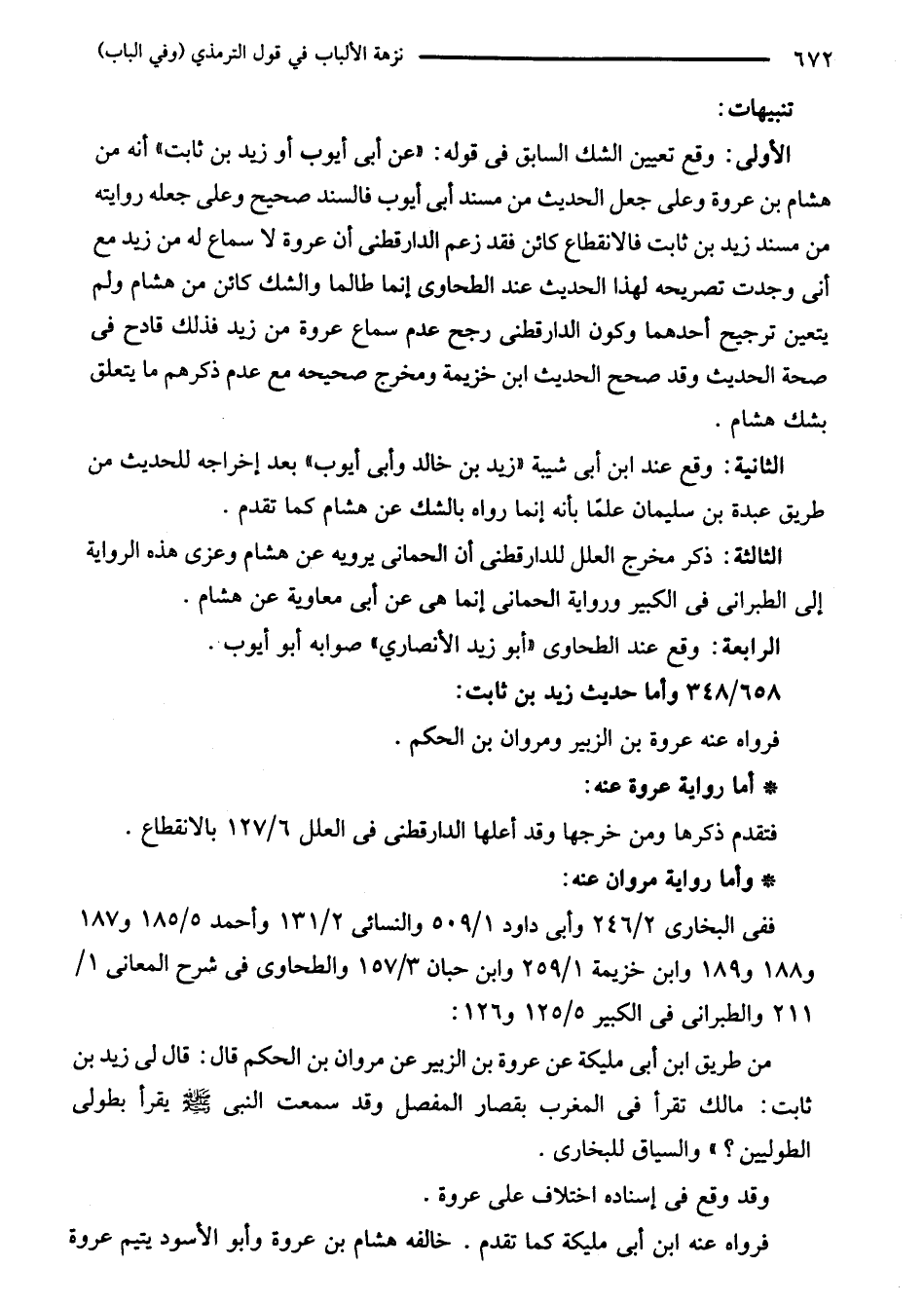 الأولى: وقع تعيين الشك السابق في قوله: "عن أبى أيوب أو زيد بن ثابت" أنه من هشام بن عروة وعلى جعل الحديث من مسند أبى أيوب فالسند صحيح وعلى جعله روايته من مسند زيد بن ثابت فالانقطاع كائن فقد زعم الدارقطني أن عروة لا سماع له من زيد مع أنى وجدت تصريحه لهذا الحديث عند الطحاوى إنما طالما والشك كائن من هشام ولم يتعين ترجيح أحدهما وكون الدارقطني رجح عدم سماع عروة من زيد فذلك قادح في صحة الحديث وقد صحع الحديث ابن خزيمة ومخرج صحيحه مع عدم ذكرهم ما يتعلق بشك هشام.
