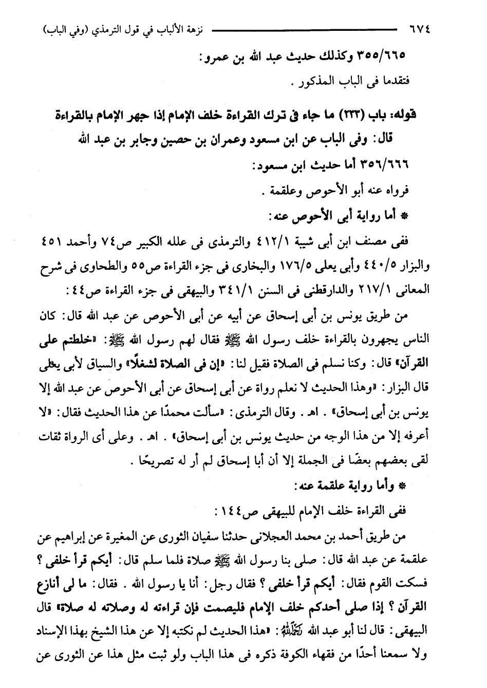 قوله: باب (233) ما جاء في ترك القراءة خلف الإمام إذا جهر الإمام بالقراءة