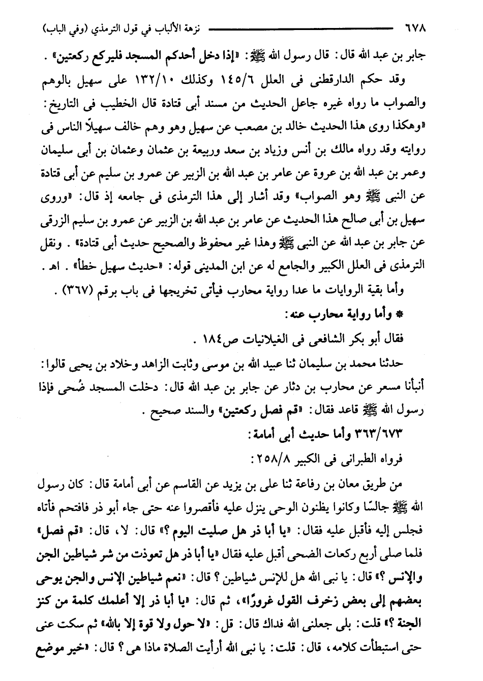 حدثنا محمَّد بن سليمان ثنا عبيد الله بن موسى وثابت الزاهد وخلاد بن يحيى قالوا: أنبأنا مسعر عن محارب بن دثار عن جابر بن عبد الله قال: دخلت المسجد ضُحى فإذا رسول الله - صلى الله عليه وسلم - قاعد فقال: "قم فصل ركعتين" والسند صحيح.