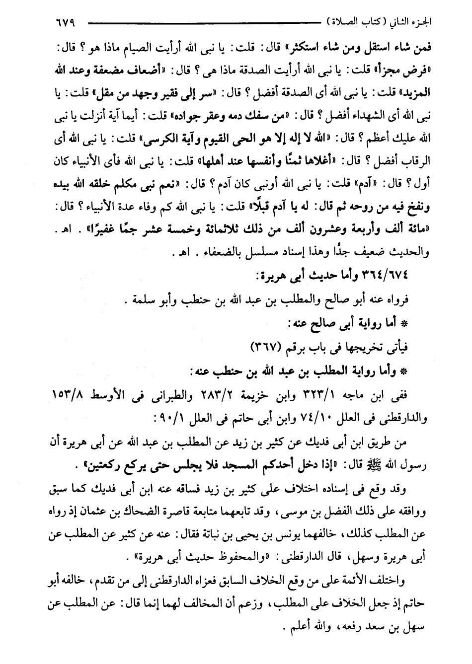من طريق ابن أبى فديك عن كثير بن زيد عن المطلب بن عبد الله عن أبى هريرة أن رسول الله - صلى الله عليه وسلم - قال: "إذا دخل أحدكم المسجد فلا يجلس حتى يركع ركعتين".