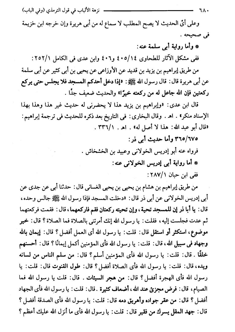 من طريق إبراهيم بن هشام بن يحيى بن يحيى الغسانى قال: حدثنا أبى عن جدى عن أبى إدريس الخولانى عن أبى ذر قال: "دخلت المسجد فإذا رسول الله - صلى الله عليه وسلم - جالس وحده، قال: يا أبا ذر إن للمسجد تحية، وإن تحيته ركعتان فقم فاركعهما، قال: فقمت فركعتهما ثم عدت فجلست إليه، فقلت: يا رسول الله إنك أمرتنى بالصلاة فما الصّلاة؟ قال: خير موضوع، استكثر أو استقل قال: قلت: يا رسول الله أي العمل أفضل؟ قال: ايمان بالله وجهاد في سبيل الله، قال: قلت: يا رسول الله فأى المؤمنين أكمل إيمانًا؟ قال: أحسنهم خلقًا. قال: قلت: يا رسول الله فأى المؤمنين أسلم؟ قال: من سلم الناس من لسانه ويده، قال: قلت: يا رسول الله فأى الصلاة أفضل؟ قال: طول القنوت قال: قلت: يا رسول الله فأى الهجرة أفضل؟ قال: من هجر السيئات. قال: قلت يا رسول الله فما الصيام؟ قال: فرض مجزئ عند الله، أضعاف كثيرة. قال: قلت: يا رسول الله فأى الجهاد أفضل؟ قال: من عقر جواده وأهريق دمه قال: قلت: يا رسول الله فأى الصدقة أفضل؟ قال: جهد المقل يسرك من فقير قال: قلت: يا رسول الله فأى ما أنزل الله عليك أعظم؟