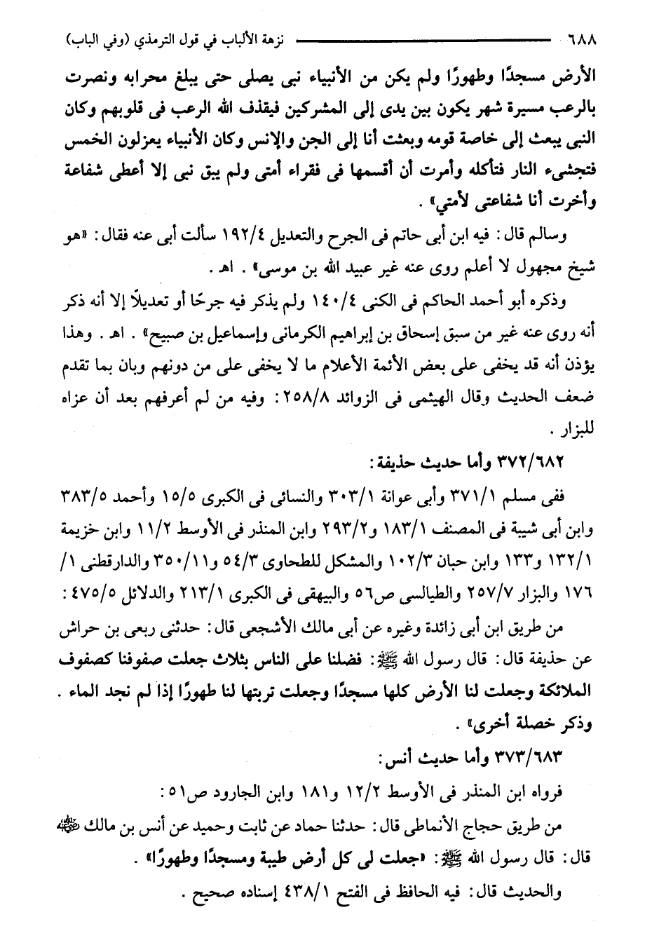 من طريق ابن أبى زائدة وغيره عن أبى مالك الأشجعى قال: حدثنى ربعى بن حراش عن حذيفة قال: قال رسول الله - صلى الله عليه وسلم -: فضلنا على الناس بثلاث جعلت صفوفنا كصفوف الملائكة وجعلت لنا الأرض كلها مسجدًا وجعلت تربتها لنا طهورًا إذا لم نجد الماء. وذكر خصلة أخرى".