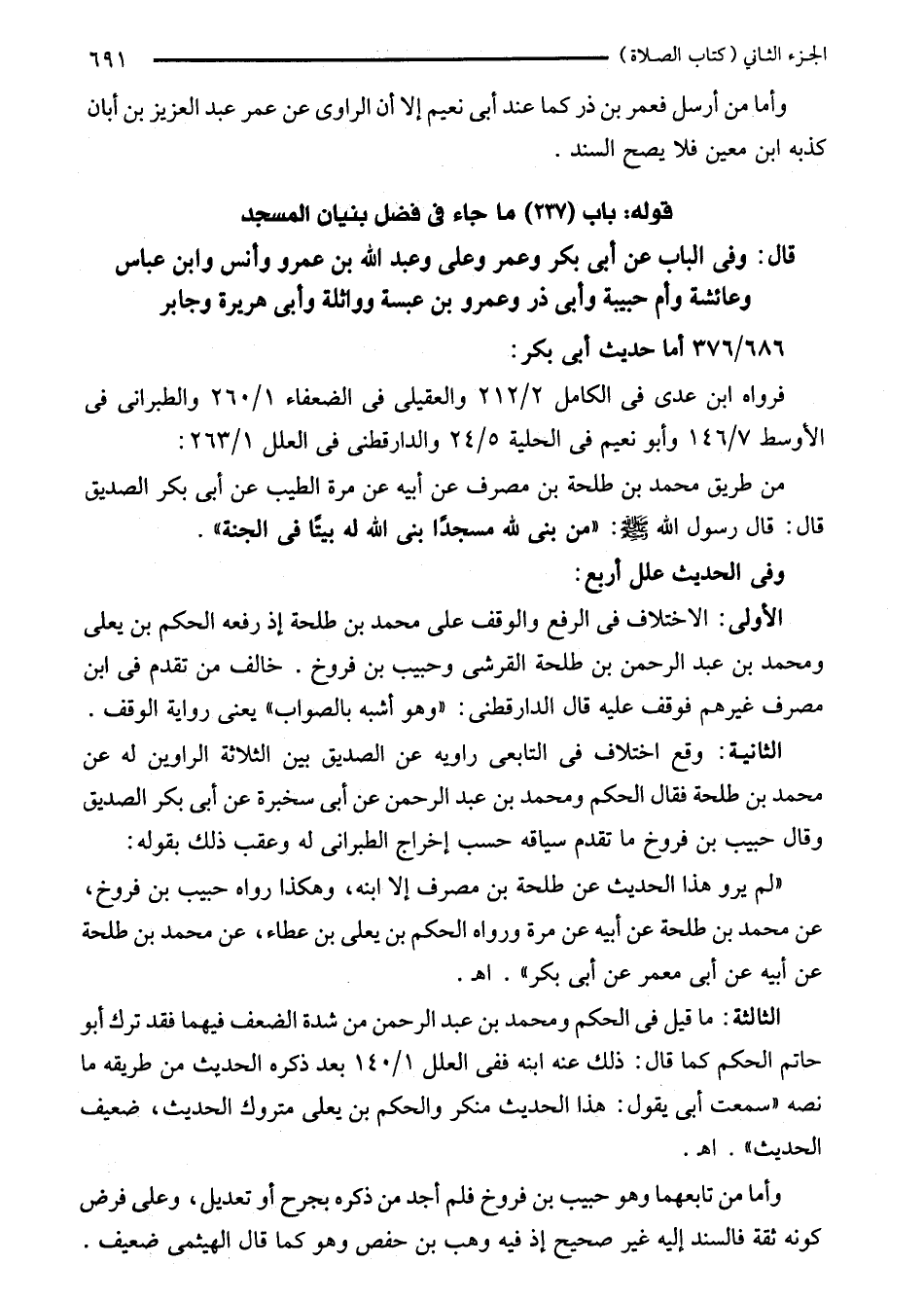 من طريق محمَّد بن طلحة بن مصرف عن أبيه عن مرة الطيب عن أبى بكر الصديق قال: قال رسول الله - صلى الله عليه وسلم -: "من بنى لله مسجدًا بنى الله له بيتًا في الجنَّة".
