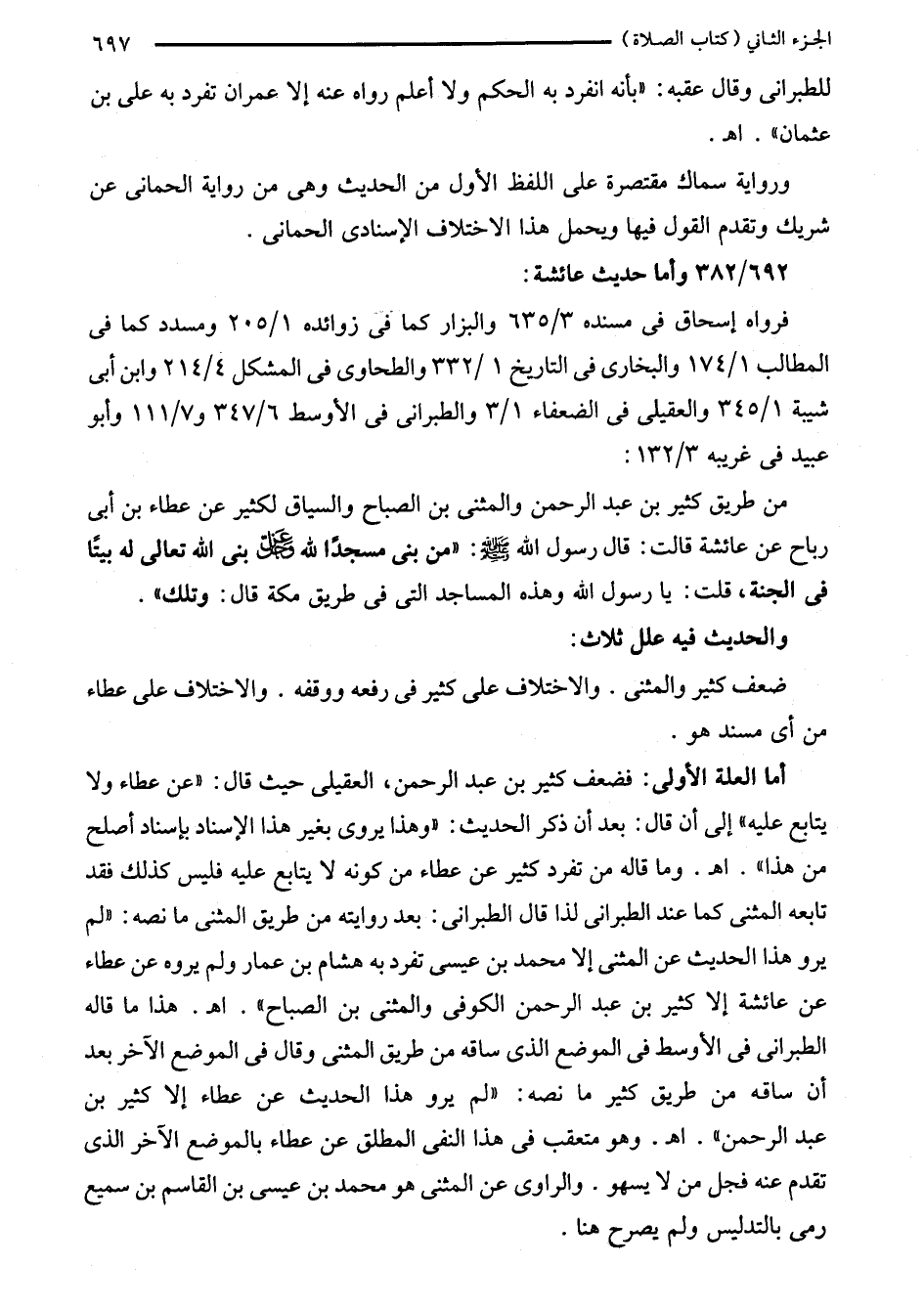 من طريق كثير بن عبد الرحمن والمثنى بن الصباح والسياق لكثير عن عطاء بن أبى رباح عن عائشة قالت: قال رسول الله - صلى الله عليه وسلم -: "من بنى مسجدًا لله -عز وجل- بنى الله تعالى له بيتًا في الجنة، قلت: يا رسول الله وهذه المساجد التى في طريق مكة قال: وتلك".