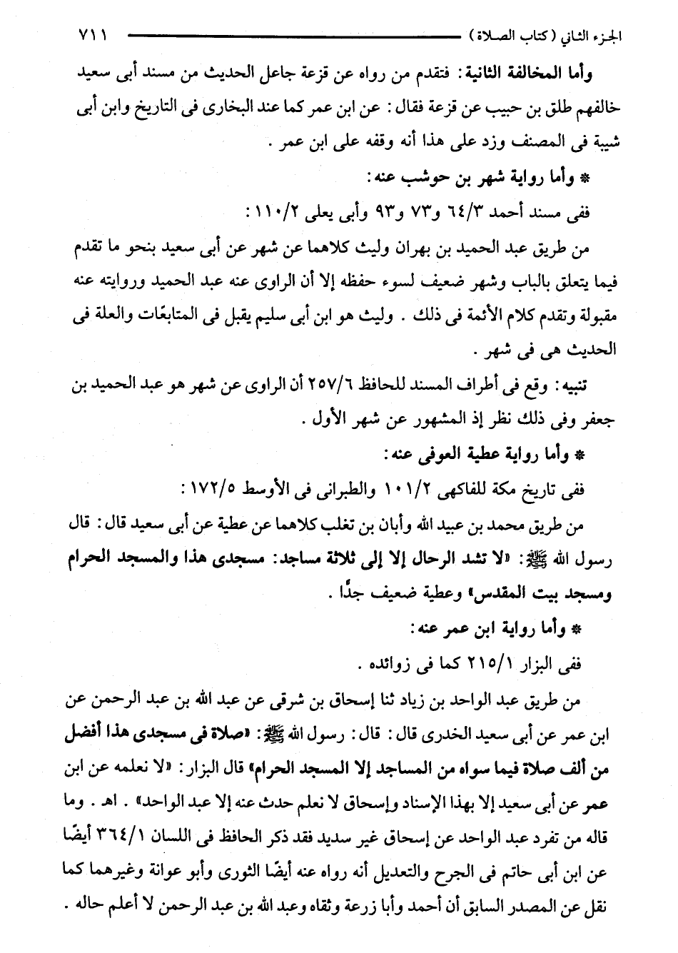 من طريق محمَّد بن عبيد الله وأبان بن تغلب كلاهما عن عطية عن أبى سعيد قال: قال رسول الله - صلى الله عليه وسلم -: "لا تشد الرحال إلا إلى ثلاثة مساجد: مسجدى هذا والمسجد الحرام ومسجد بيت المقدس" وعطية ضعيف جدًا.