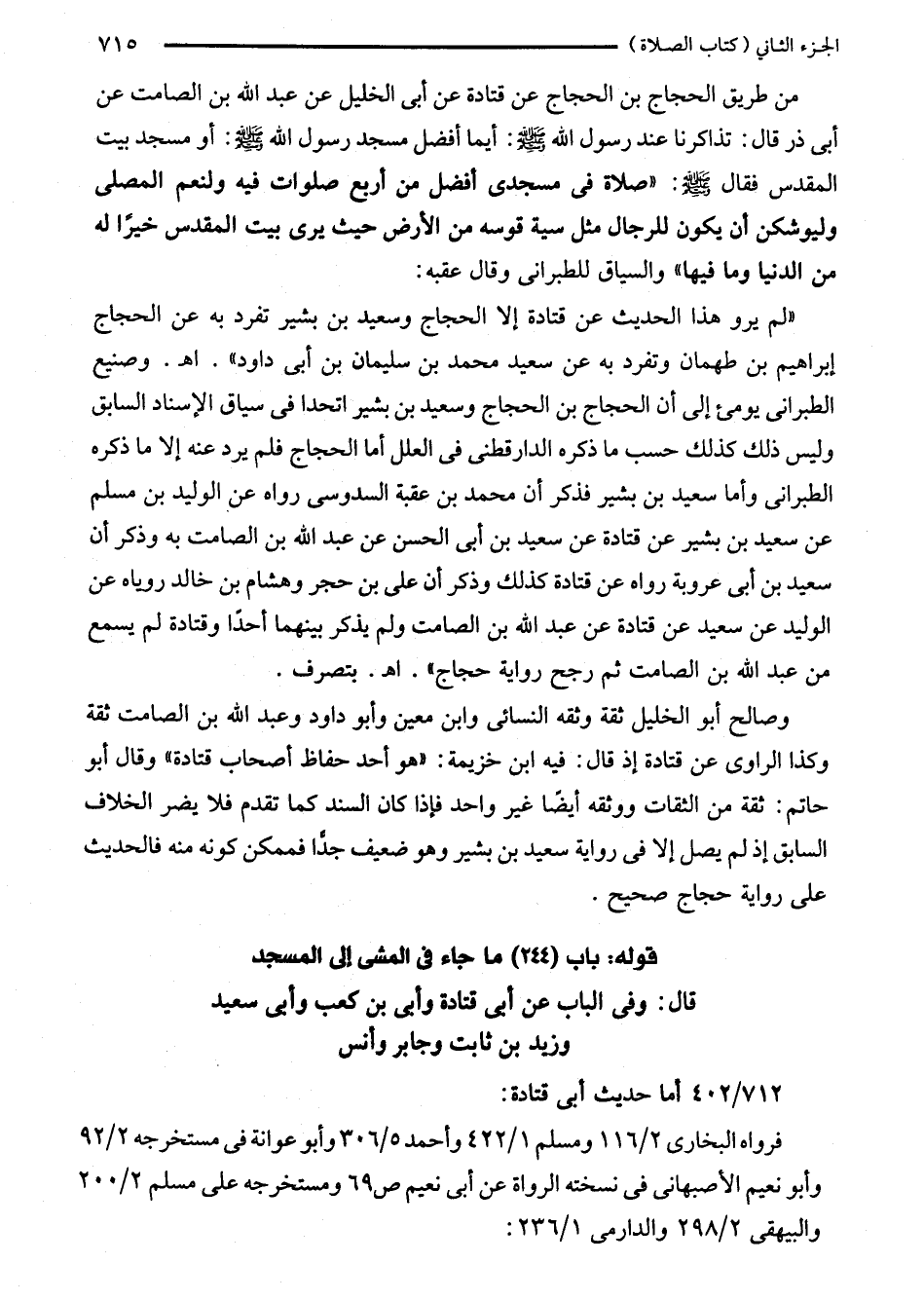 من طريق الحجاج بن الحجاج عن قتادة عن أبى الخليل عن عبد الله بن الصامت عن أبى ذر قال: تذاكرنا عند رسول الله - صلى الله عليه وسلم -: أيما أفضل مسجد رسول الله - صلى الله عليه وسلم -: أو مسجد بيت المقدس فقال - صلى الله عليه وسلم -: "صلاة في مسجدى أفضل من أربع صلوات فيه ولنعم المصلى وليوشكن أن يكون للرجال مثل سية قوسه من الأرض حيث يرى بيت المقدس خيرًا له من الدنيا وما فيها" والسياق للطبراني وقال عقبه: