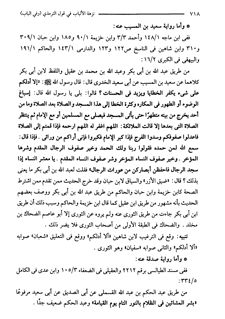 من طريق عبد الله بن أبى بكر وعبد الله بن محمَّد بن عقيل واللفظ لابن أبى بكر كلاهما عن سعيد بن المسيب عن أبى سعيد الخدرى قال: قال رسول الله - صلى الله عليه وسلم -: "ألا أدلكم على شىء يكفر الخطايا ويزيد في الحسنات؟ قالوا: بلى يا رسول الله قال: إسباغ الوضوء أو الطهور في المكاره وكثرة الخطا إلى هذا المسجد والصلاة بعد الصلاة وما من أحد يخرج من بيته متطهرًا حتى يأتى المسجد فيصلى مع المسلمين أو مع الإمام ثم ينتظر الصلاة التى بعدها إلا قالت الملائكة: اللهم اغفر له اللهم ارحمه فإذا قمتم إلى الصلاة فاعدلوا صفوفكم وسدوا الفرج فإذا كبر الإمام فكبروا فإنى أراكم من ورائى، فإذا قال: سمع الله لمن حمده فقولوا ربنا ولك الحمد وخير صفوف الرجال المقدم وشرها المؤخر. وخير صفوت النساء المؤخر وشر صفوت النساء المقدم. يا معشر النساء إذا سجد الرجال فاحفظن أبصاركن من عورات الرجال" فقلت لعبد الله بن أبى بكر ما يعنى بذلك؟ قال: "ضيق الأزر" والسياق لابن حبان وقد خرج الحديث ممن تقدم ممن اشترط الصحة كابن خزيمة وابن حبان والحاكم من طريق عبد الله بن أبى بكر ووصف بعضهم الحديث بأنه مشهور من طريق ابن عقيل كما قال ابن خزيمة والحاكم وسبب ذلك أن طريق ابن أبى بكر جاءت من طريق الثورى عنه ولم يروه عن الثورى إلا أبو عاصم الضحاك بن مخلد. والضحاك في الطبقة الأولى من أصحاب الثورى فلا يضر ذلك.