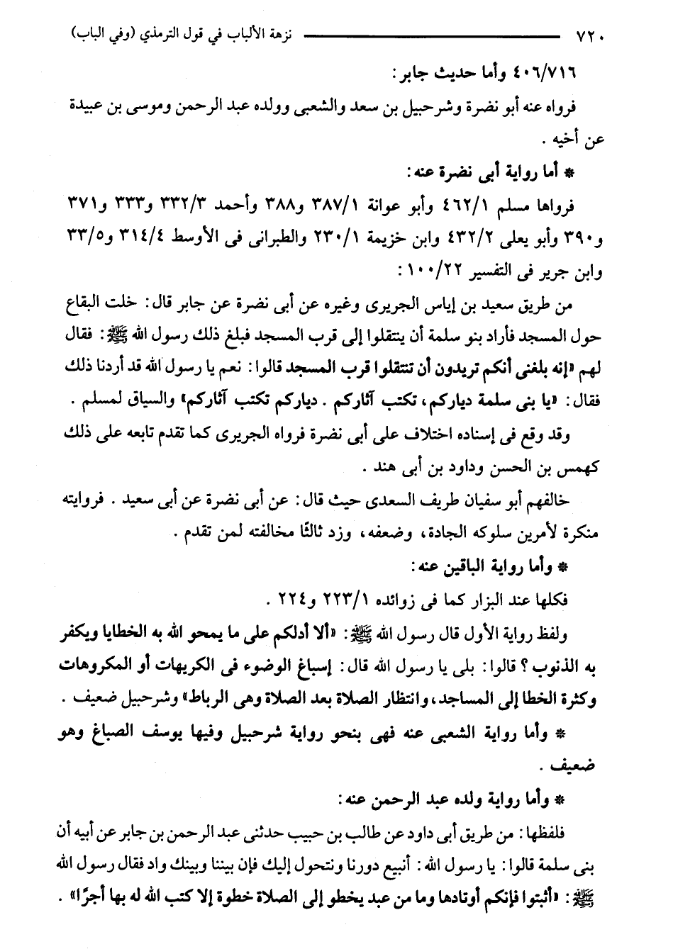من طريق سعيد بن إياس الجريرى وغيره عن أبى نضرة عن جابر قال: خلت البقاع حول المسجد فأراد بنو سلمة أن ينتقلوا إلى قرب المسجد فبلغ ذلك رسول الله - صلى الله عليه وسلم -: فقال لهم "أنه بلغى أنكم تريدون أن تنتقلوا قرب المسجد قالوا: نعم يا رسول الله قد أردنا ذلك فقال: "يا بنى سلمة دياركم، تكتب آثاركم. دياركم تكتب آثاركم" والسياق لمسلم.
