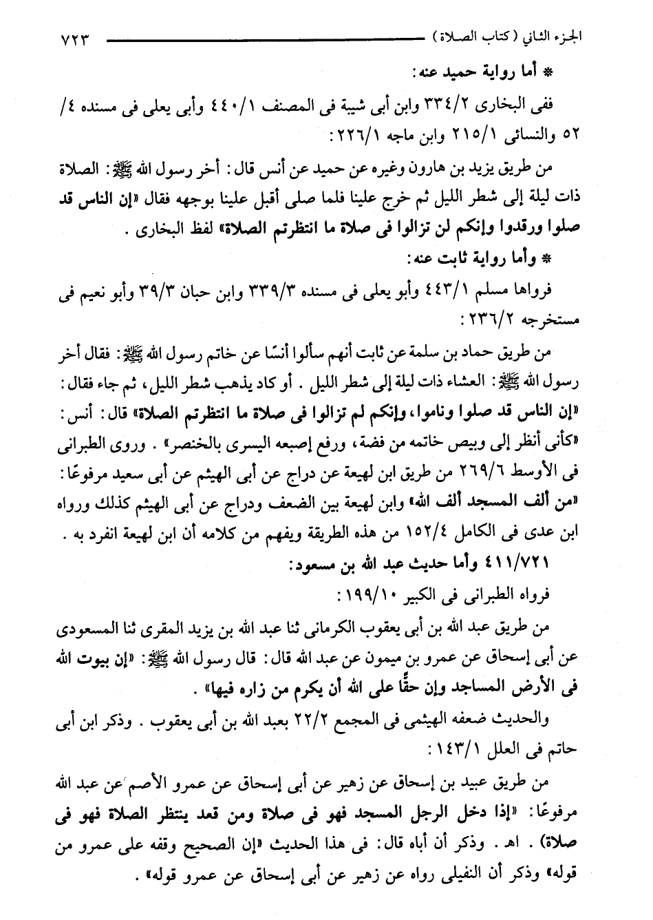 من طريق حماد بن سلمة عن ثابت أنهم سألوا أنسًا عن خاتم رسول الله - صلى الله عليه وسلم -: فقال أخر رسول الله - صلى الله عليه وسلم -: العشاء ذات ليلة إلى شطر الليل. أو كاد يذهب شطر الليل، ثم جاء فقال: "إن الناس قد صلوا وناموا، وإنكم لم تزالوا في صلاة ما انتظرتم الصلاة" قال: أنس: "كأنى أنظر إلى وبيص خاتمه من فضة، ورفع إصبعه اليسرى بالخنصر". وروى الطبراني في الأوسط 6/ 269 من طريق ابن لهيعة عن دراج عن أبى الهيثم عن أبى سعيد مرفوعًا: "من ألف المسجد ألف الله" وابن لهيعة بين الضعف ودراج عن أبى الهيثم كذلك ورواه ابن عدى في الكامل 4/ 152 من هذه الطريقة ويفهم من كلامه أن ابن لهيعة انفرد به.