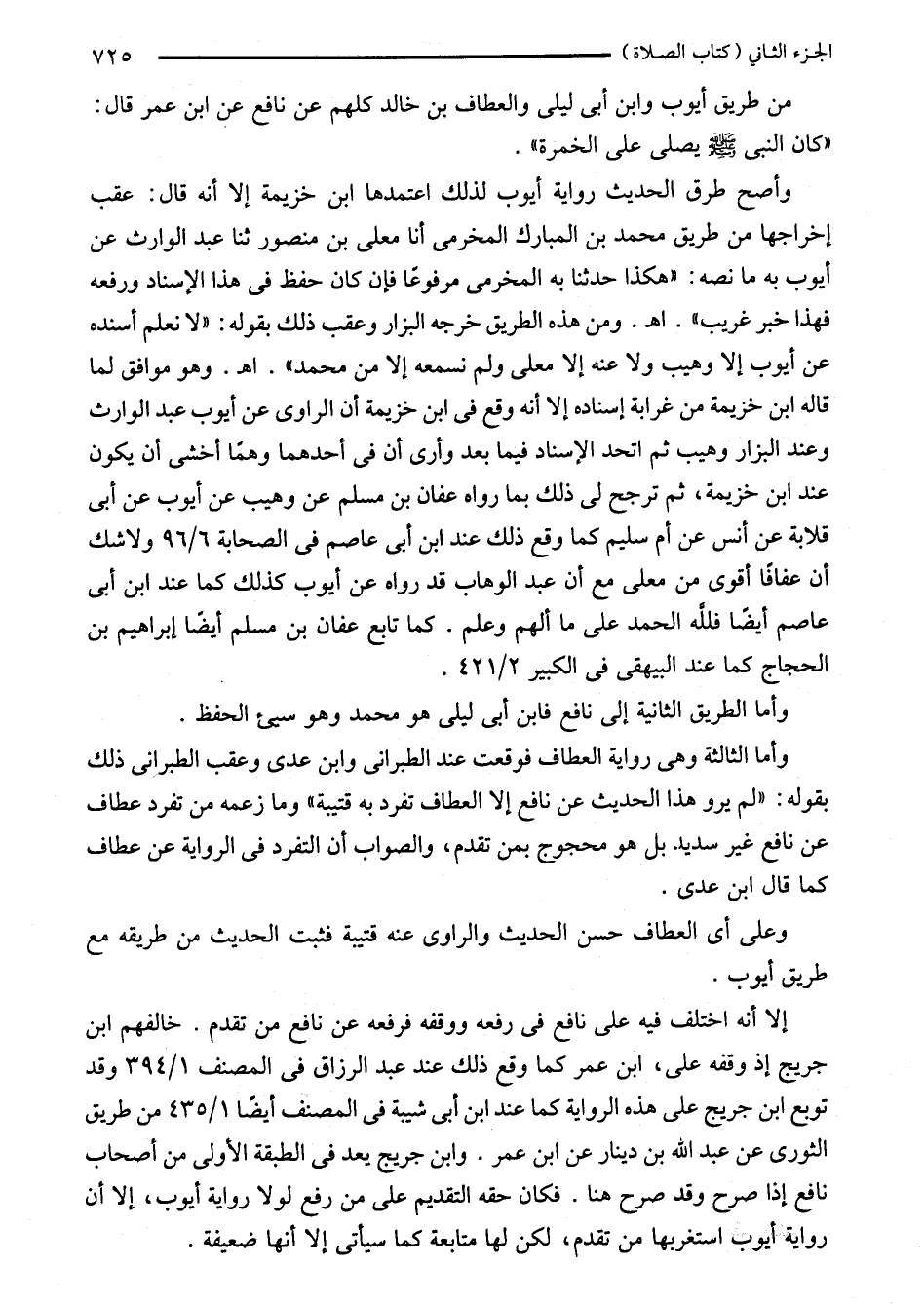 إلا أنه اختلف فيه على نافع في رفعه ووقفه فرفعه عن نافع من تقدم. خالفهم ابن جريج إذ وقفه على، ابن عمر كما وقع ذلك عند عبد الرزاق في المصنف 1/ 394 وقد توبع ابن جريج على هذه الرواية كما عند ابن أبى شيبة في المصنف أيضًا 1/ 435 من طريق الثورى عن عبد الله بن دينار عن ابن عمر. وابن جريج يعد في الطبقة الأولى من أصحاب نافع إذا صرح وقد صرح هنا. فكان حقه التقديم على من رفع لولا رواية أيوب، إلا أن رواية أيوب استغربها من تقدم، لكن لها متابعة كما سيأتى إلا أما ضعيفة.
