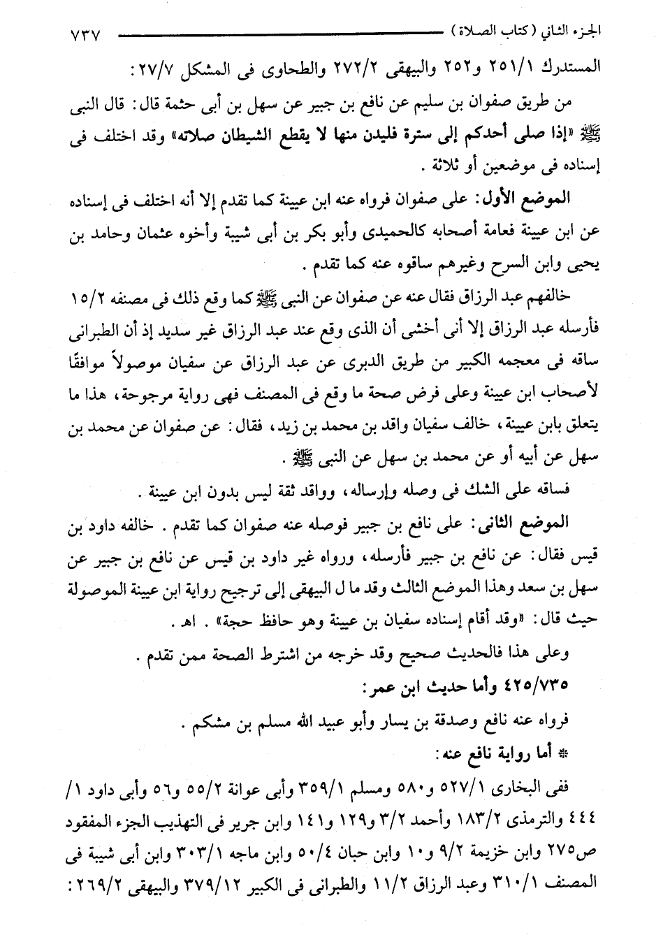 من طريق صفوان بن سليم عن نافع بن جبير عن سهل بن أبى حثمة قال: قال النبي - صلى الله عليه وسلم - "إذا صلى أحدكم إلى سترة فليدن منها لا يقطع الشيطان صلاته" وقد اختلف في إسناده في موضعين أو ثلاثة.