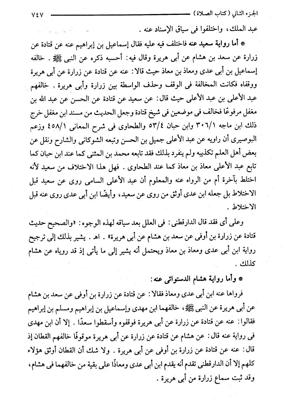 فرواها عنه ابن أبى عدى ومعاذ فقالا: عن قتادة عن زرارة بن أوفى عن سعد بن هشام عن أبى هريرة عن النبي - صلى الله عليه وسلم -، خالفهما ابن مهدى وإسماعيل بن إبراهيم ومسلم بن إبراهيم فقالوا: عنه عن قتادة عن زرارة عن أبى هريرة فوقفوه وأسقطوا سعدًا. إلا أن ابن مهدى في رواية عنه قال: عن هشام عن قتادة عن زرارة عن أبى هريرة موقوفًا خالفهم القطان إذ قال: عنه عن قتادة عن زرارة بن أوفى عن أبى هريرة. ولا شك أن القطان أوثق هؤلاء كلهم إلا أن الدارقطني تقدم أنه يقدم ابن أبى عدى ومعاذًا على بقية من خالفهما في هشام، وقد ثبت سماع زرارة من أبى هريرة.