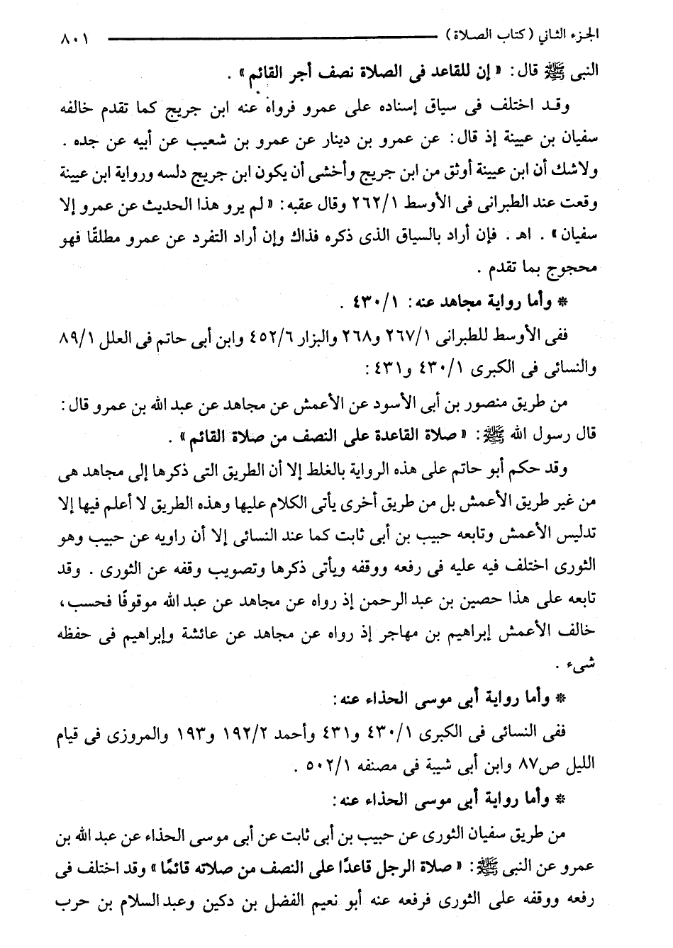 من طريق سفيان الثورى عن حبيب بن أبى ثابت عن أبى موسى الحذاء عن عبد الله بن عمرو عن النبي - صلى الله عليه وسلم -: "صلاة الرجل قاعدًا على النصف من صلاته قائمًا" وقد اختلف في رفعه ووقفه على الثورى فرفعه عنه أبو نعيم الفضل بن دكين وعبد السلام بن حرب