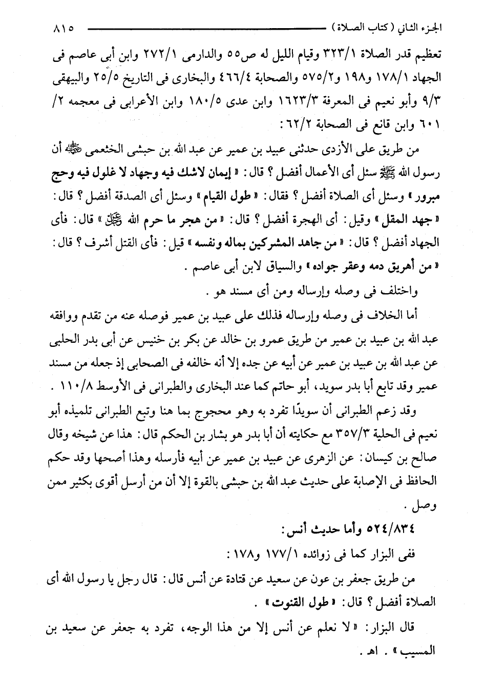 من طريق على الأزدى حدثنى عبيد بن عمير عن عبد الله بن حبشى الخثعمى - صلى الله عليه وسلم - أن رسول الله - صلى الله عليه وسلم - سئل أي الأعمال أفضل؟ قال: "إيمان لا شك فيه وجهاد لا غلول فيه وحج مبرور" وسئل أي الصلاة أفضل؟ فقال: "طول القيام" وسئل أي الصدقة أفضل؟ قال: "جهد المقل" وقيل: أي الهجرة أفضل؟ قال: "من هجر ما حرم الله -عز وجل-" قال: فأى الجهاد أفضل؟ قال: "من جاهد المشركين بماله ونفسه" قيل: فأى القتل أشرف؟ قال: "من أهريق دمه وعقر جواده" والسياق لابن أبى عاصم.