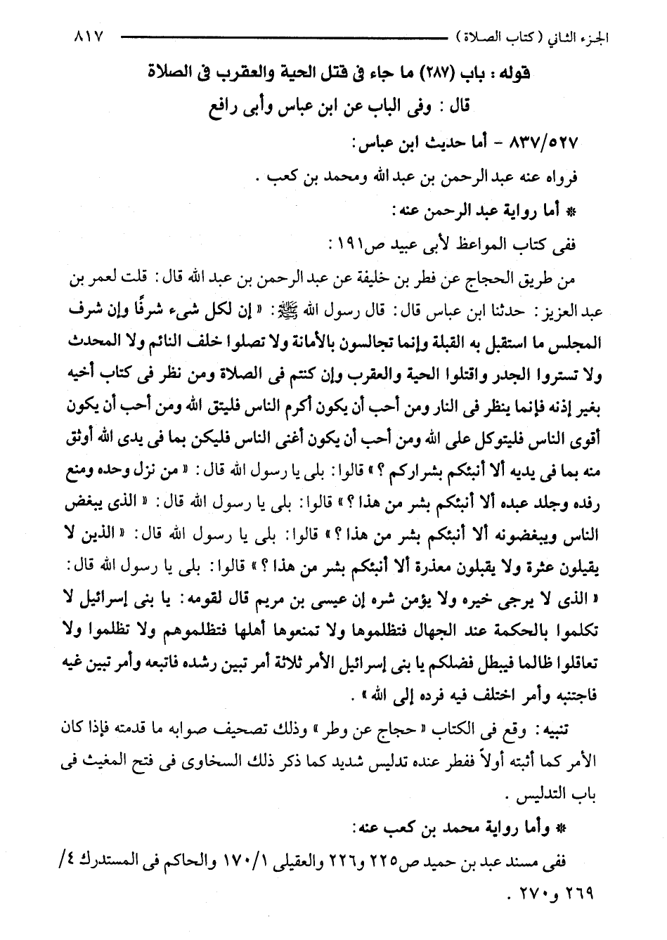 قوله: باب (287) ما جاء في قتل الحية والعقرب في الصلاة