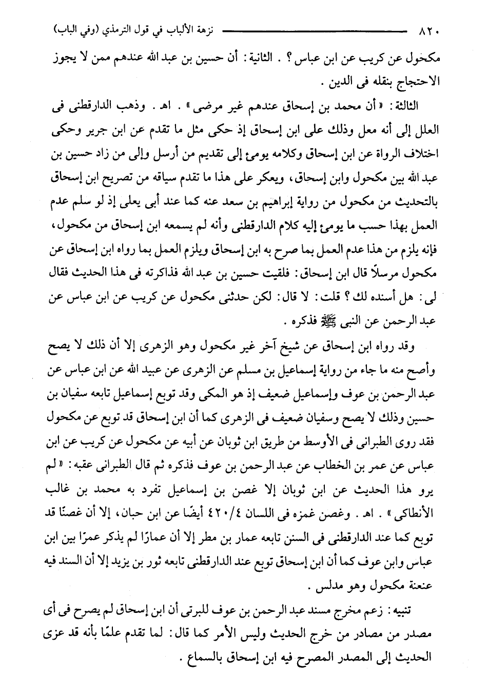 الثالثة: "أن محمد بن إسحاق عندهم غير مرضى". اهـ. وذهب الدارقطني في العلل إلى أنه معل وذلك على ابن إسحاق إذ حكى مثل ما تقدم عن ابن جرير وحكى اختلاف الرواة عن ابن إسحاق وكلامه يومىء إلى تقديم من أرسل وإلى من زاد حسين بن عبد الله بين مكحول وابن إسحاق، ويعكر على هذا ما تقدم سياقه من تصريح ابن إسحاق بالتحديث من مكحول من رواية إبراهيم بن سعد عنه كما عند أبى يعلى إذ لو سلم عدم العمل بهذا حسب ما يومئ إليه كلام الدارقطني وأنه لم يسمعه ابن إسحاق من مكحول، فإنه يلزم من هذا عدم العمل بما صرح به ابن إسحاق ويلزم العمل بما رواه ابن إسحاق عن مكحول مرسلًا قال ابن إسحاق: فلقيت حسين بن عبد الله فذاكرته في هذا الحديث فقال لى: هل أسنده لك؟ قلت: لا قال: لكن حدثنى مكحول عن كريب عن ابن عباس عن عبد الرحمن عن النبي - صلى الله عليه وسلم - فذكره.