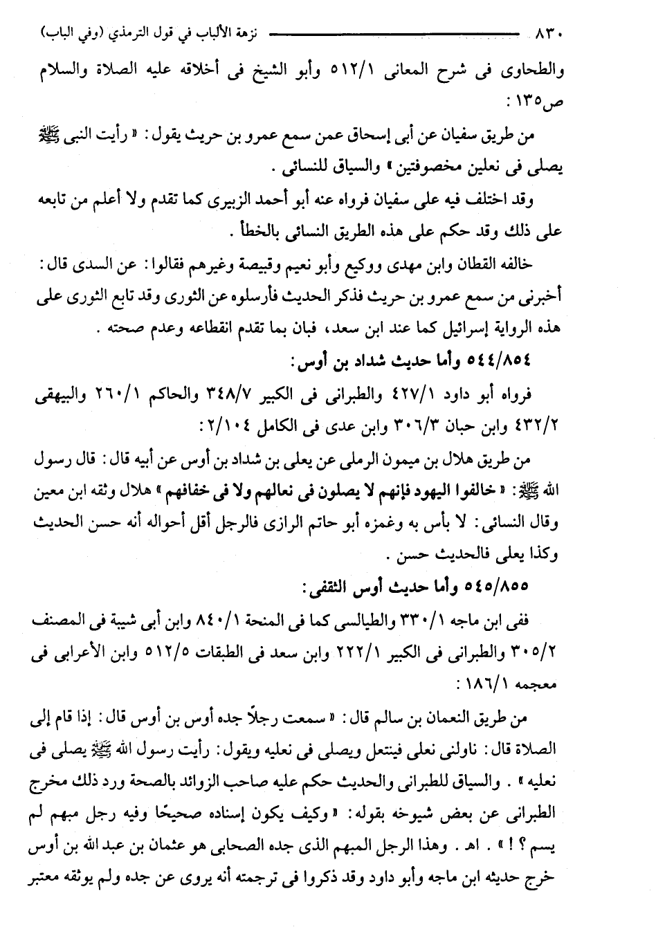 من طريق النعمان بن سالم قال: "سمعت رجلًا جده أوس بن أوس قال: إذا قام إلى الصلاة قال: ناولنى نعلى فينتعل ويصلى في نعليه ويقول: رأيت رسول الله - صلى الله عليه وسلم - يصلى في نعليه". والسياق للطبراني والحديث حكم عليه صاحب الزوائد بالصحة ورد ذلك مخرج الطبراني عن بعض شيوخه بقوله: "وكيف يكون إسناده صحيحًا وفيه رجل مبهم لم يسم؟! ". اهـ. وهذا الرجل المبهم الذى جده الصحابي هو عثمان بن عبد الله بن أوس خرج حديثه ابن ماجه وأبو داود وقد ذكروا في ترجمته أنه يروى عن جده ولم يوثقه معتبر
