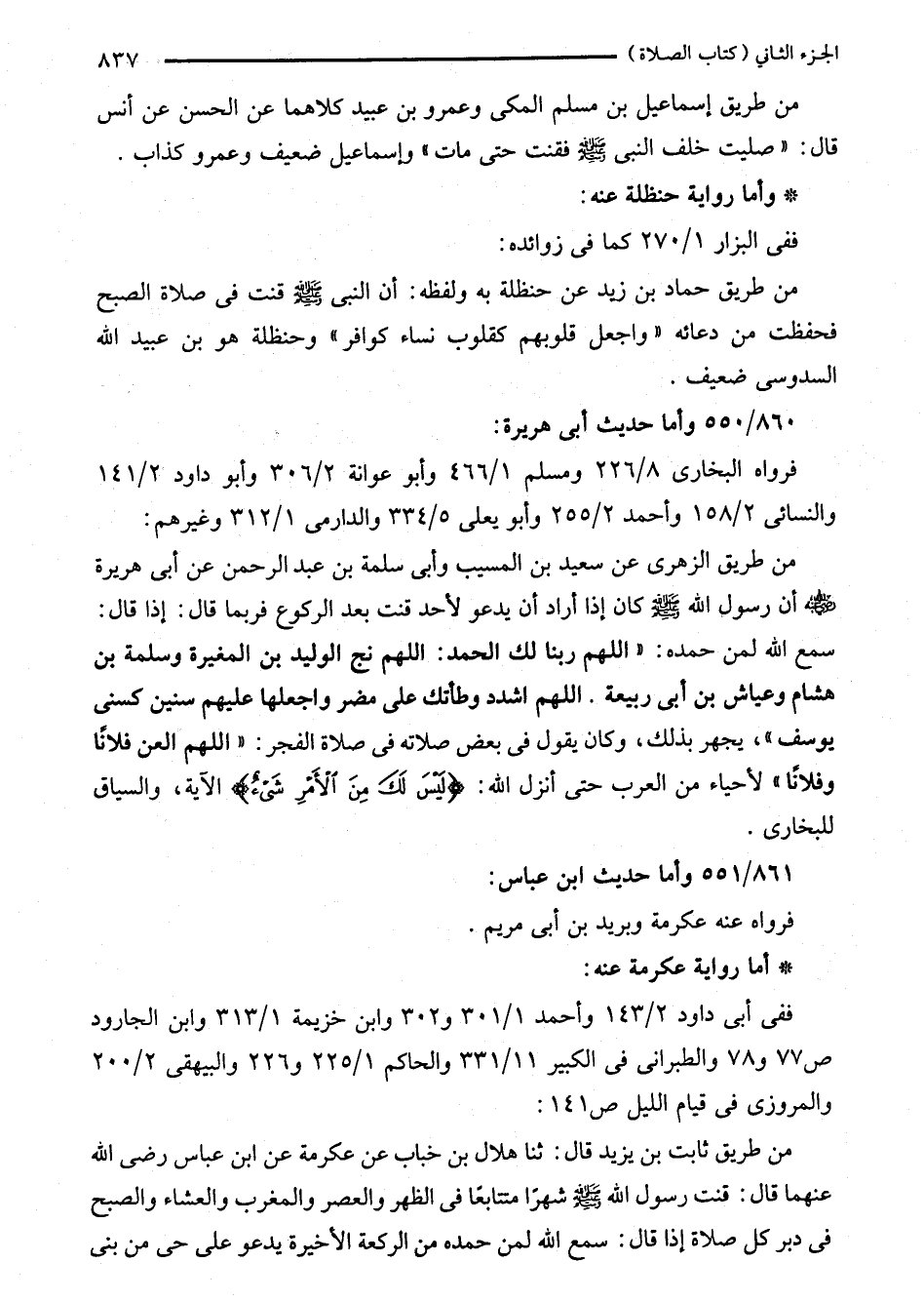 من طريق ثابت بن يزيد قال: ثنا هلال بن خباب عن عكرمة عن ابن عباس رضى الله عنهما قال: قنت رسول الله - صلى الله عليه وسلم - شهرًا متتابعًا في الظهر والعصر والمغرب والعشاء والصبح في دبر كل صلاة إذا قال: سمع الله لمن حمده من الركعة الأخيرة يدعو على حى من بنى