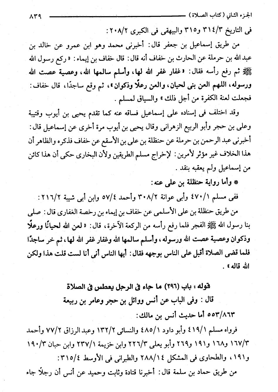 من طريق حنظلة بن على الأسلمى عن خفاف بن إيماء بن رخصة الغفارى قال: صلى بنا رسول الله - صلى الله عليه وسلم - الفجر فلما رفع رأسه من الركعة الآخرة، قال: "لعون الله لحيانًا ورعلًا وذكوان وعصية عصت الله ورسوله، وأسلم سالمها الله وغفار كفر الله لها، ثم خر ساجدًا فلما قضى الصلاة أقبل على الناس بوجهه فقال: أيها الناس أنى أنا لست قلت هذا ولكن الله قاله".