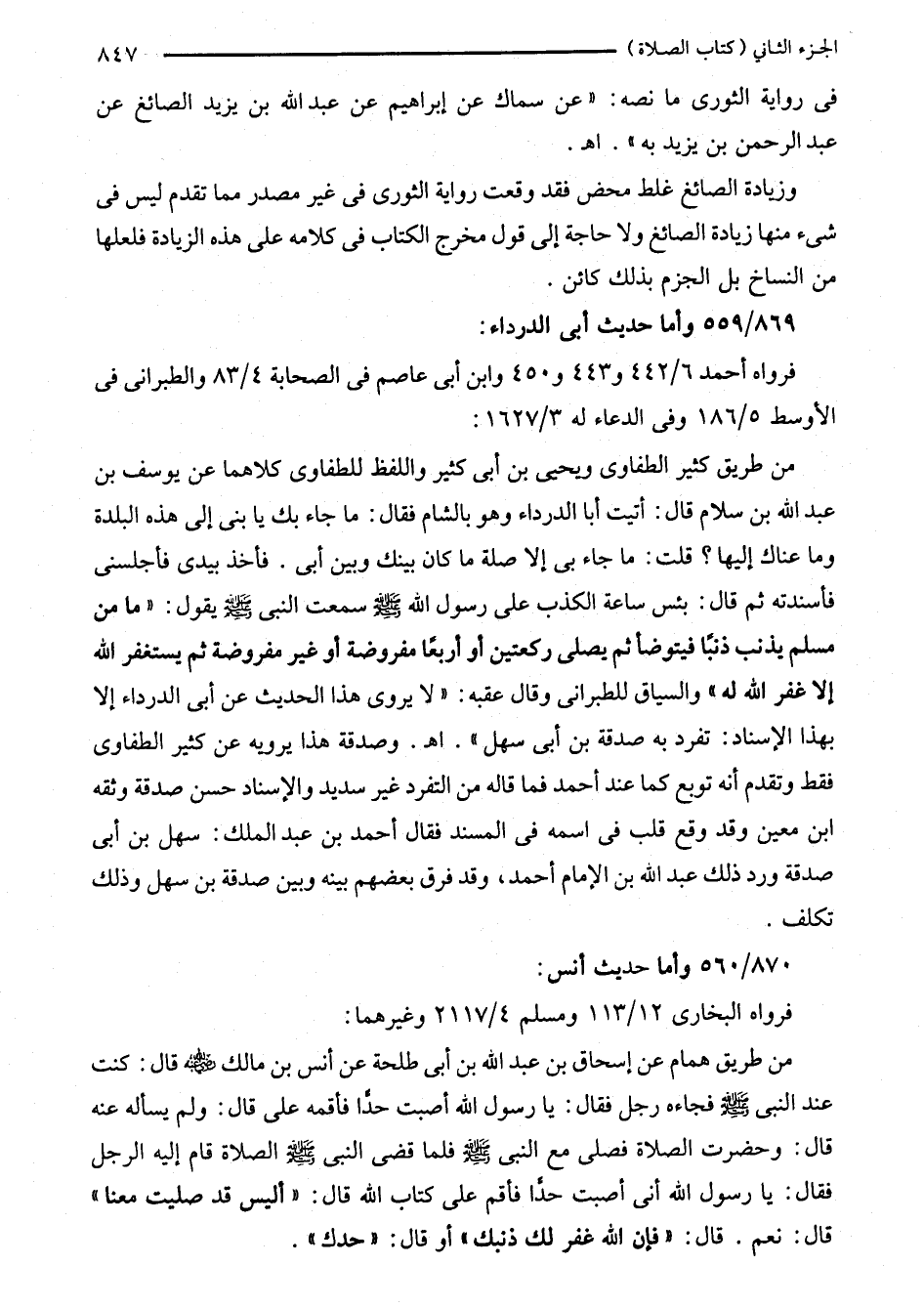 من طريق كثير الطفاوى ويحيى بن أبى كثير واللفظ للطفاوى كلاهما عن يوسف بن عبد الله بن سلام قال: أتيت أبا الدرداء وهو بالشام فقال: ما جاء بك يا بنى إلى هذه البلدة وما عناك إليها؟ قلت: ما جاء بى إلا صلة ما كان بينك وبين أبى. فأخذ بيدى فأجلسنى فأسندته ثم قال: بئس ساعة الكذب على رسول الله - صلى الله عليه وسلم - سمعت النبي - صلى الله عليه وسلم - يقول: "ما من مسلم يذنب ذنبًا فيتوضأ ثم يصلى ركعتين أو أربعًا مفروضة أو غير مفروضة ثم يستغفر الله إلا غفر الله له" والسياق للطبراني وقال عقبه: "لا يروى هذا الحديث عن أبى الدرداء إلا بهذا الإسناد: تفرد به صدقة بن أبى سهل". اهـ. وصدقة هذا يرويه عن كثير الطفاوى فقط وتقدم أنه توبع كما عند أحمد فما قاله من التفرد غير سديد والإسناد حسن صدقة وثقه ابن معين وقد وقع قلب في اسمه في المسند فقال أحمد بن عبد الملك: سهل بن أبى صدقة ورد ذلك عبد الله بن الإمام أحمد، وقد فرق بعضهم بينه وبين صدقة بن سهل وذلك تكلف.