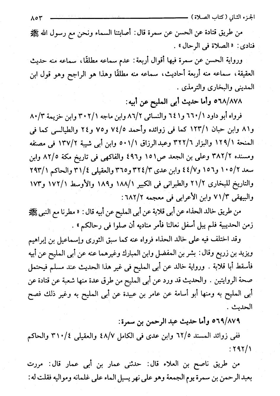 من طريق خالد الحذاء عن أبى قلابة عن أبى المليح عن أبيه قال: "مطرنا مع النبي - صلى الله عليه وسلم - زمن الحديبية فلم يبل أسفل نعالنا فأمر مناديه أن صلوا في رحالكم".