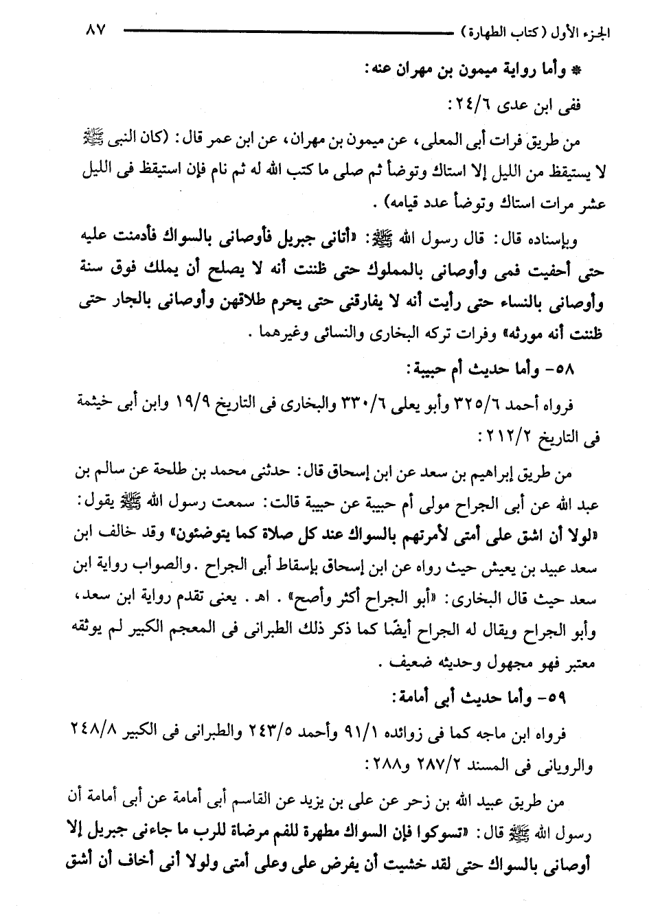 من طريق إبراهيم بن سعد عن ابن إسحاق قال: حدثنى محمد بن طلحة عن سالم بن عبد الله عن أبى الجراح مولى أم حبيبة عن حبيبة قالت: سمعت رسول الله - صلى الله عليه وسلم - يقول: "لولا أن اشق على أمتى لأمرتهم بالسواك عند كل صلاة كما يتوضئون" وقد خالف ابن سعد عبيد بن يعيش حيث رواه عن ابن إسحاق بإسقاط أبى الجراح. والصواب رواية ابن سعد حيث قال البخاري: "أبو الجراح أكثر وأصح". اهـ. يعنى تقدم رواية ابن سعد، وأبو الجراح ويقال له الجراح أيضًا كما ذكر ذلك الطبراني في المعجم الكبير لم يوثقه معتبر فهو مجهول وحديثه ضعيف.