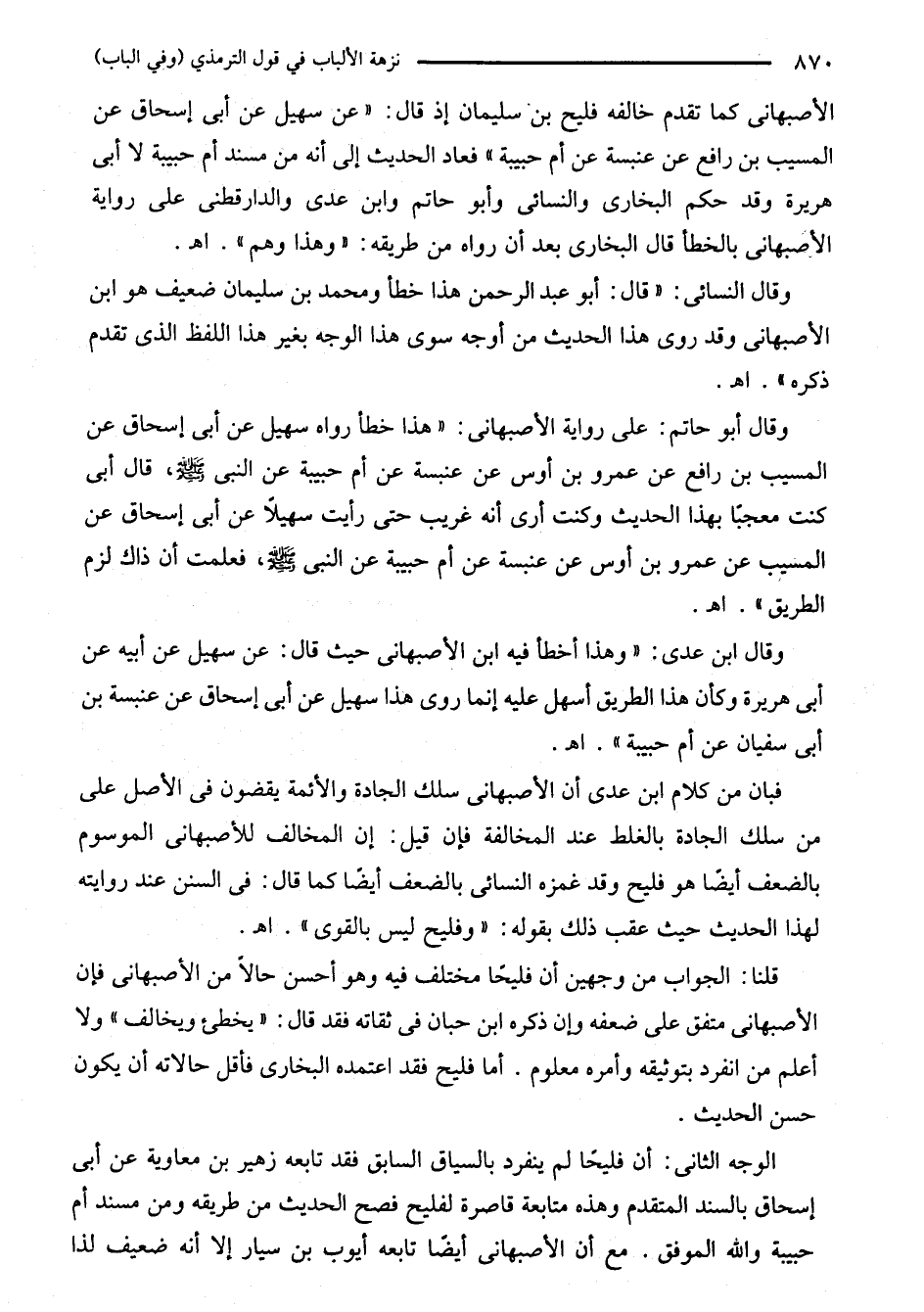 الأصبهانى كما تقدم خالفه فليح بن سليمان إذ قال: "عن سهيل عن أبى إسحاق عن المسيب بن رافع عن عنبسة عن أم حبيبة" فعاد الحديث إلى أنه من مسند أم حبيبة لا أبى هريرة وقد حكم البخاري والنسائي وأبو حاتم وابن عدى والدارقطني على رواية الأصبهانى بالخطأ قال البخاري بعد أن رواه من طريقه: "وهذا وهم". اهـ.