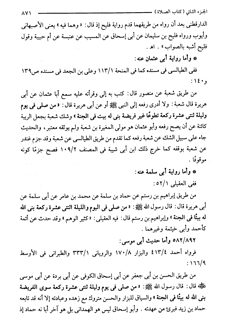 من طريق إبراهيم بن رستم عن حماد بن سلمة عن محمد بن عامر عن أبى سلمة عن أبى هريرة قال: قال رسول الله - صلى الله عليه وسلم -: "من صلى في اليوم والليلة اثنتى عشرة ركعة بنى الله له بيتًا في الجنة" وإبراهيم بن رستم قال: فيه العقيلى: "كثير الوهم" وقد حدث عن أئمة كأحمد وأبى خيثمة وغيرهما.