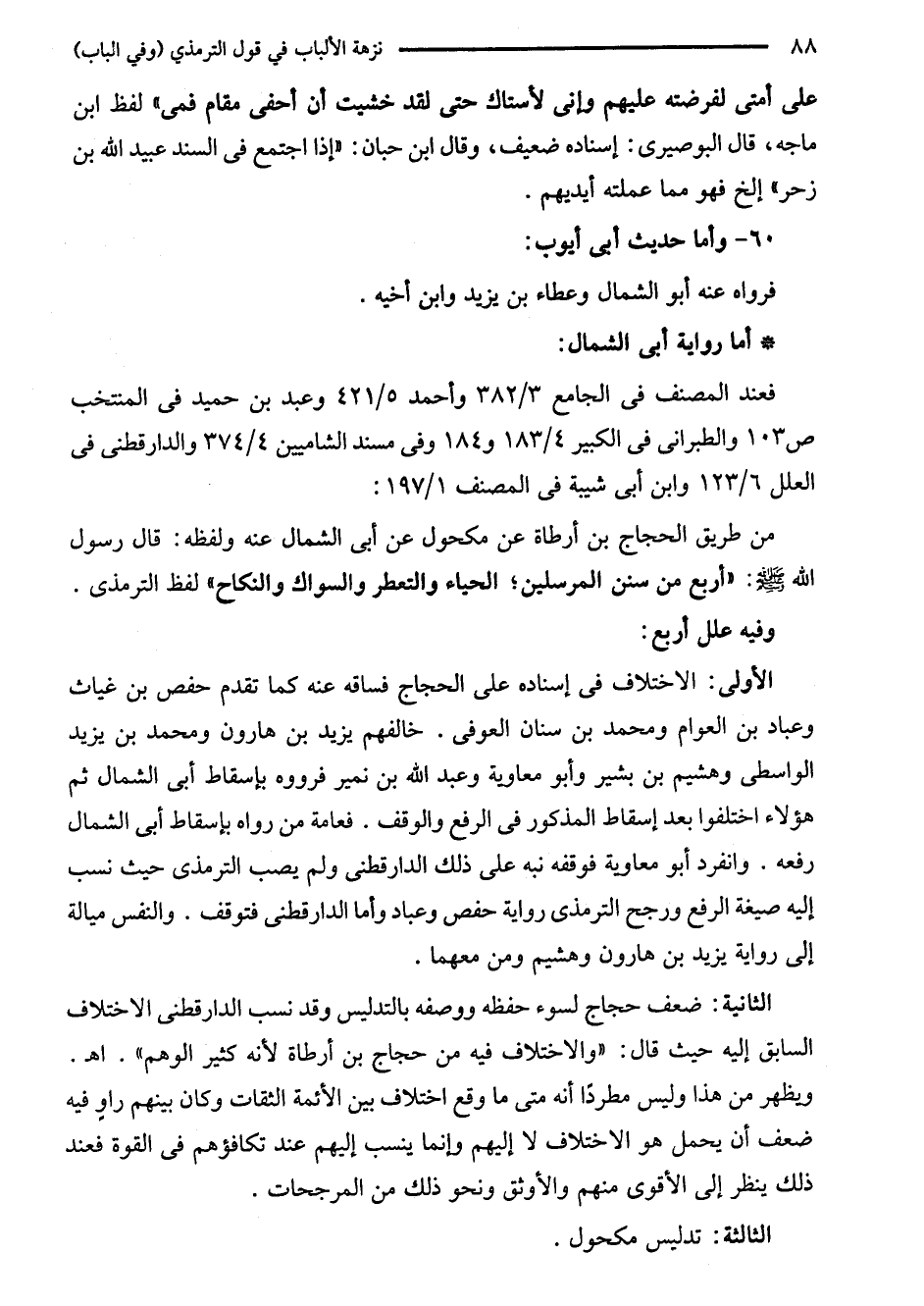 الأولى: الاختلاف في إسناده على الحجاج فساقه عنه كما تقدم حفص بن غياث وعباد بن العوام ومحمد بن سنان العوفى. خالفهم يزيد بن هارون ومحمد بن يزيد الواسطى وهشيم بن بشير وأبو معاوية وعبد الله بن نمير فرووه بإسقاط أبى الشمال ثم هؤلاء اختلفوا بعد إسقاط المذكور في الرفع والوقف. فعامة من رواه بإسقاط أبى الشمال رفعه. وانفرد أبو معاوية فوقفه نبه على ذلك الدارقطني ولم يصب الترمذي حيث نسب إليه صيغة الرفع ورجح الترمذي رواية حفص وعباد وأما الدارقطني فتوقف. والنفس ميالة إلى رواية يزيد بن هارون وهشيم ومن معهما.