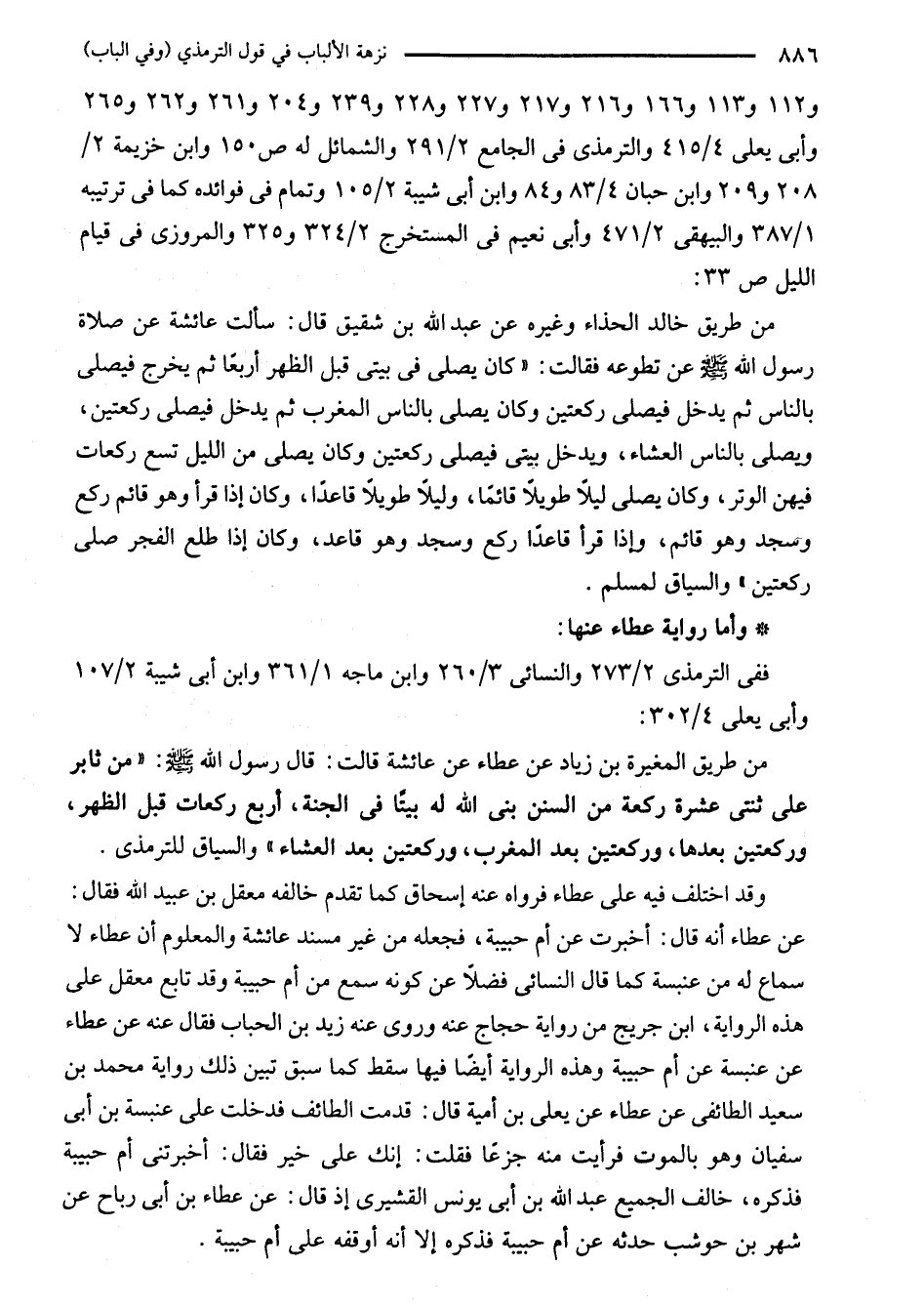 من طريق المغيرة بن زياد عن عطاء عن عائشة قالت: قال رسول الله - صلى الله عليه وسلم -: "من ثابر على ثنتى عشرة ركعة من السنن بنى الله له بيتًا في الجنة، أربع ركعات قبل الظهر، وركعتين بعدها، وركعتين بعد المغرب، وركعتين بعد العشاء" والسياق للترمذي.