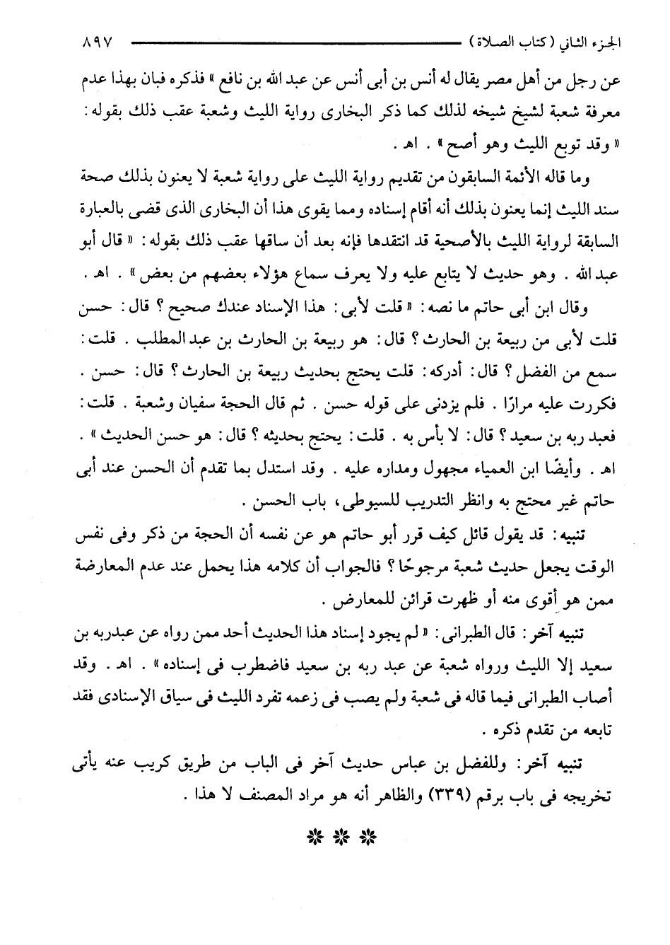 وقال ابن أبى حاتم ما نصه: "قلت لأبى: هذا الإسناد عندك صحيح؟ قال: حسن قلت لأبى من ربيعة بن الحارث؟ قال: هو ربيعة بن الحارث بن عبد المطلب. قلت: سمع من الفضل؟ قال: أدركه: قلت يحتج بحديث ربيعة بن الحارث؟ قال: حسن. فكررت عليه مرارًا. فلم يزدنى على قوله حسن. ثم قال الحجة سفيان وشعبة. قلت: فعبد ربه بن سعيد؟ قال: لا بأس به. قلت: يحتج بحديثه؟ قال: هو حسن الحديث". اهـ. وأيضًا ابن العمياء مجهول ومداره عليه. وقد استدل بما تقدم أن الحسن عند أبى حاتم غير محتج به وانظر التدريب للسيوطى، باب الحسن.
