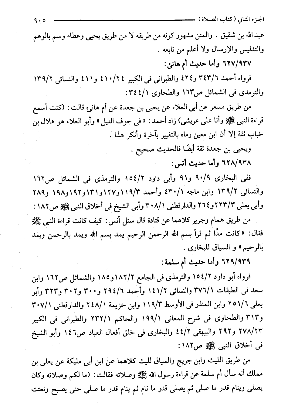 فرواه أبو داود 2/ 154 والترمذي في الجامع 2/ 182 و 185 والشمائل ص 162 وابن سعد في الطبقات 1/ 376 والنسائي 1/ 142 وأحمد 6/ 294 و 300 و 302 و 323 وأبو يعلى 6/ 251 وابن المنذر في الأوسط 3/ 119 وابن خزيمة 1/ 248 والدارقطني 1/ 307 و 313 والطحاوى في شرح المعانى 1/ 199 والحاكم 1/ 232 والطبراني في الكبير 23/ 278 و 292 والبيهقي 2/ 44 والبخاري في خلق أفعال العباد ص 146 وأبو الشيخ في أخلاق النبي - صلى الله عليه وسلم - 182: