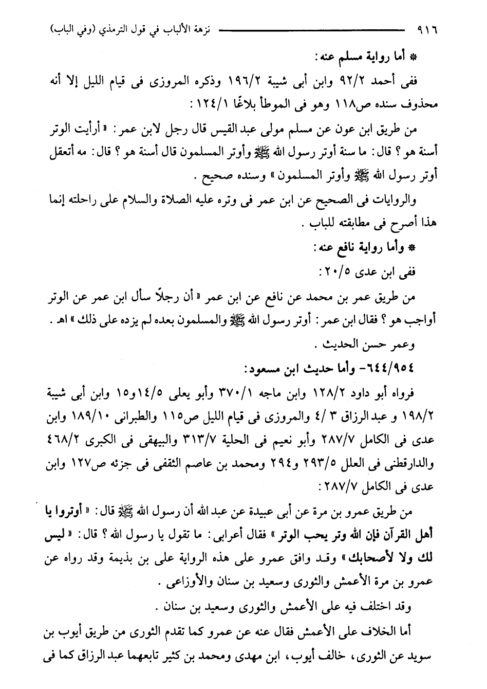 من طريق عمرو بن مرة عن أبى عبيدة عن عبد الله أن رسول الله - صلى الله عليه وسلم - قال: "أوتروا يا أهل القرآن فإن الله وتر يحب الوتر" فقال أعرابى: ما تقول يا رسول الله؟ قال: "ليس لك ولا لأصحابك" وقد وافق عمرو على هذه الرواية على بن بذيمة وقد رواه عن عمرو بن مرة الأعمش والثورى وسعيد بن سنان والأوزاعى.