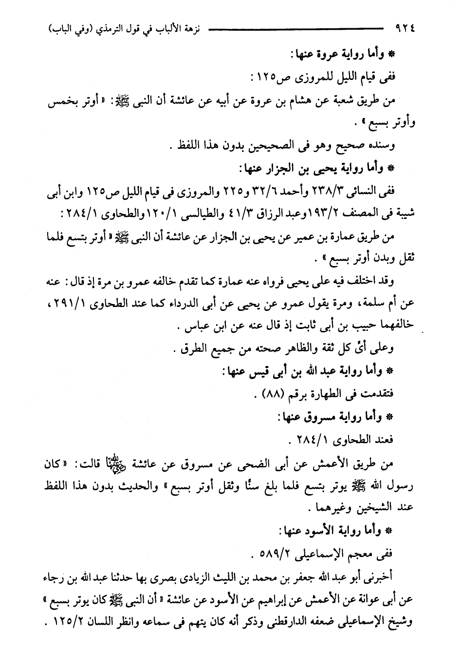 من طريق عمارة بن عمير عن يحيى بن الجزار عن عائشة أن النبي - صلى الله عليه وسلم - "أوتر بتسع فلما ثقل وبدن أوتر بسبع".