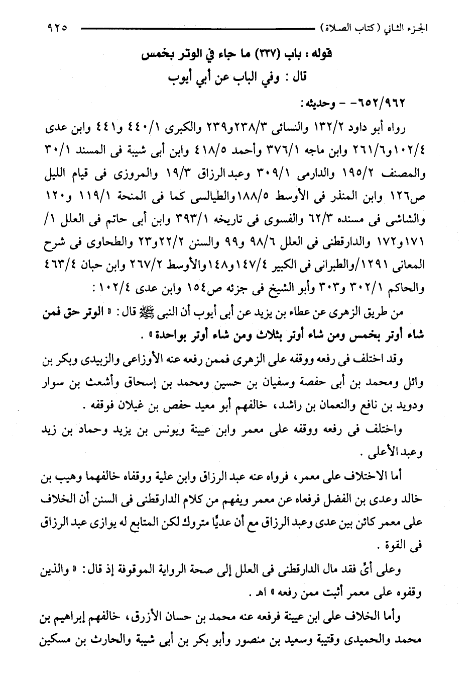 رواه أبو داود 2/ 132 والنسائي 3/ 238 و 239 والكبرى 1/ 440 و 441 وابن عدى 4/ 102 و 6/ 261 وابن ماجه 1/ 376 وأحمد 5/ 418 وابن أبى شيبة في المسند 1/ 30 والمصنف 2/ 195 والدارمي 1/ 309 وعبد الرزاق 3/ 19 والمروزى في قيام الليل ص 126 وابن المنذر في الأوسط 5/ 188 والطيالسى كما في المنحة 1/ 119 و 120 والشاشى في مسنده 3/ 62 والفسوى في تاريخه 1/ 393 وابن أبى حاتم في العلل 1/ 171 و 172 والدارقطني في العلل 6/ 98 و 99 والسنن 2/ 22 و 23 والطحاوى في شرح المعانى 1291/ والطبراني في الكبير 4/ 147 و 148 والأوسط 2/ 267 وابن حبان 4/ 463 والحاكم 1/ 302 و 303 وأبو الشيخ في جزئه ص 154 وابن عدى 4/ 102: