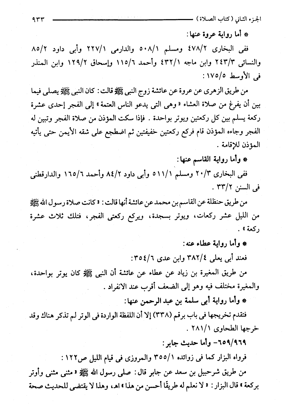 من طريق الزهرى عن عروة عن عائشة زوج النبي - صلى الله عليه وسلم - قالت: كان النبي - صلى الله عليه وسلم - يصلى فيما بين أن يفرغ من صلاة العشاء "وهى التى يدعو الناس العتمة" إلى الفجر إحدى عشرة ركعة يسلم بين كل ركعتين ويوتر بواحدة. فإذا سكت المؤذن من صلاة الفجر وتبين له الفجر وجاءه المؤذن قام فركع ركعتين خفيفتين ثم اضطجع على شقه الأيمن حتى يأتيه المؤذن لإقامة.