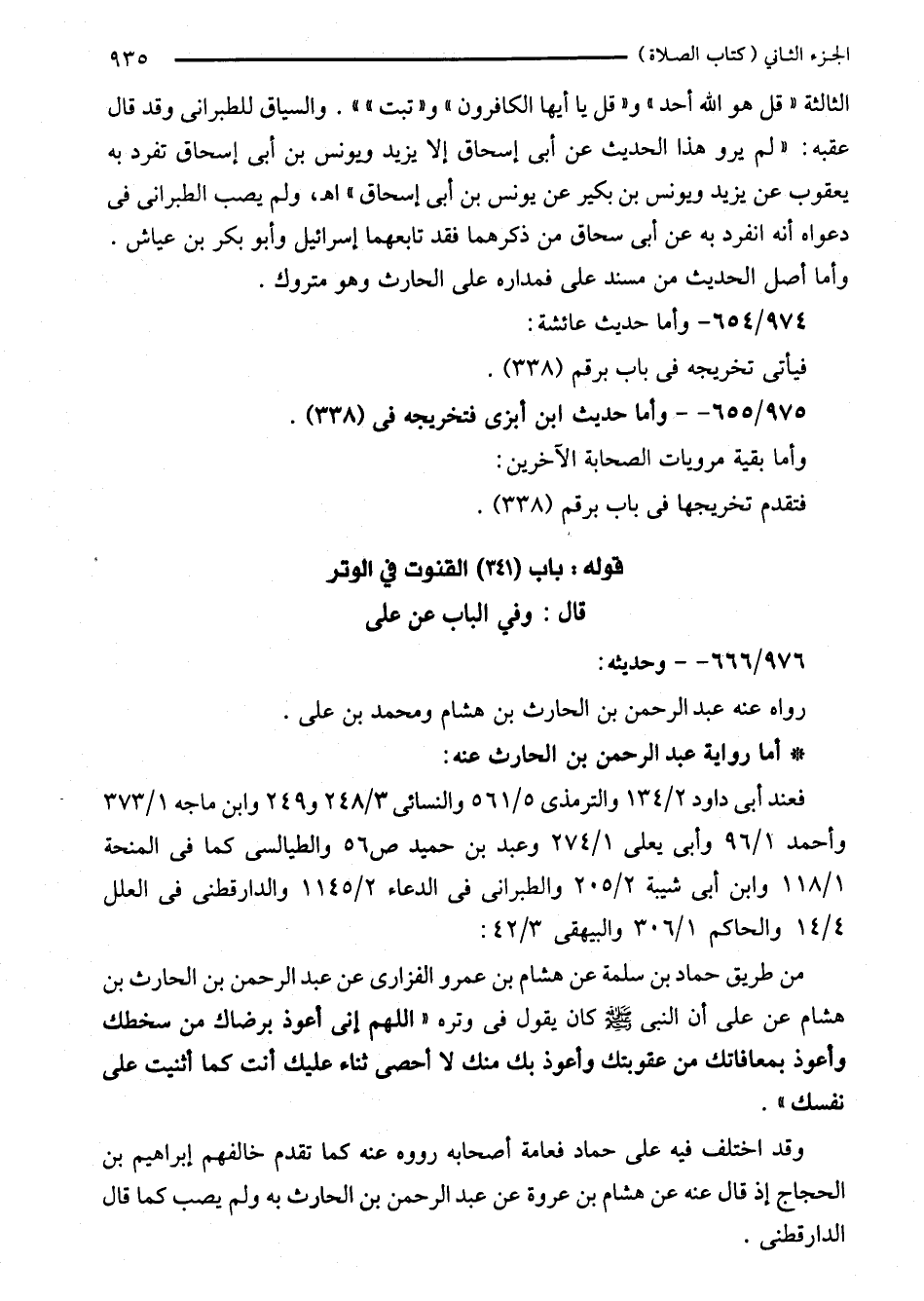 من طريق حماد بن سلمة عن هشام بن عمرو الفزارى عن عبد الرحمن بن الحارث بن هشام عن على أن النبي - صلى الله عليه وسلم - كان يقول في وتره "اللهم إنى أعوذ برضاك من سخطك وأعوذ بمعافاتك من عقوبتك وأعوذ بك منك لا أحصى ثناء عليك أنت كما أثنيت على نفسك".