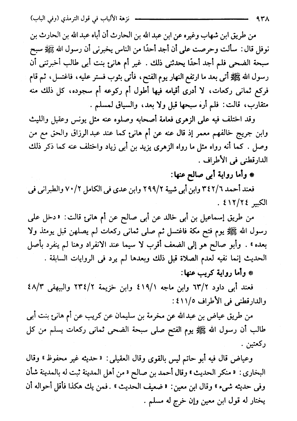 من طريق ابن شهاب وغيره عن ابن عبد الله بن الحارث أن أباه عبد الله بن الحارث بن نوفل قال: سألت وحرصت على أن أجد أحدًا من الناس يخبرنى أن رسول الله - صلى الله عليه وسلم - سبح سبحة الضحى فلم أجد أحدًا يحدثنى ذلك. غير أم هانئ بنت أبى طالب أخبرتنى أن رسول الله - صلى الله عليه وسلم - أتى بعد ما ارتفع النهار يوم الفتح، فأتى بثوب فستر عليه، فاغتسل، ثم قام فركع ثمانى ركعات، لا أدرى أقيامه فيها أطول أم ركوعه أم سجوده، كل ذلك منه متقارب، قالت: فلم أره سبحها قبل ولا بعد، والسياق لمسلم.