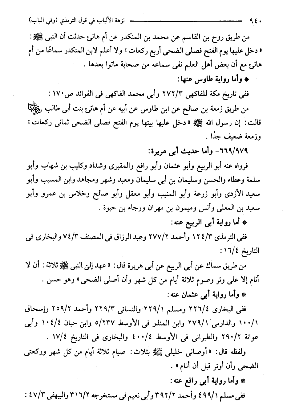 من طريق روح بن القاسم عن محمد بن المنكدر عن أم هانئ حدثت أن النبي - صلى الله عليه وسلم -: "دخل عليها يوم الفتح فصلى الضحى أربع ركعات" ولا أعلم لابن المنكدر سماعًا من أم هانئ مع أن بعض أهل العلم نفى سماعه من صحابة ماتوا بعدها.