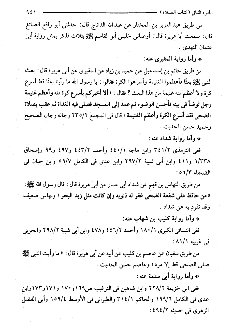 من طريق حاتم بن إسماعيل عن حميد بن زياد عن المقبرى عن أبى هريرة قال: بعث النبي - صلى الله عليه وسلم - بعثًا فأعظموا الغنيمة وأسرعوا الكرة فقالوا: يا رسول الله ما رأينا بعثًا قط أسرع كرة ولا أعظم منه غنيمة من هذا البعث؟ فقال: "ألا أخبركم بأسرع كرة منه وأعظم غنيمة رجل توضأ في بيته فأحسن الوضوء ثم عمد إلى المسجد فصلى فيه الغداة ثم عقب بصلاة الضحى فقد أسرع الكرة وأعظم الغنيمة" قال في المجمع 2/ 235 رجاله رجال الصحيح وحميد حسن الحديث.