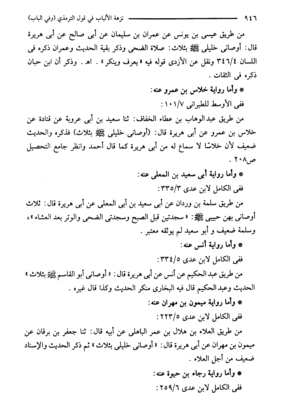 من طريق عيسى بن يونس عن عمران بن سليمان عن أبى صالح عن أبى هريرة قال: أوصانى خليلى - صلى الله عليه وسلم - بثلاث: صلاة الضحى وذكر بقية الحديث وعمران ذكره في اللسان 4/ 346 ونقل عن الأزدى قوله فيه "يعرف وينكر". اهـ. وذكر أن ابن حبان ذكره في الثقات.