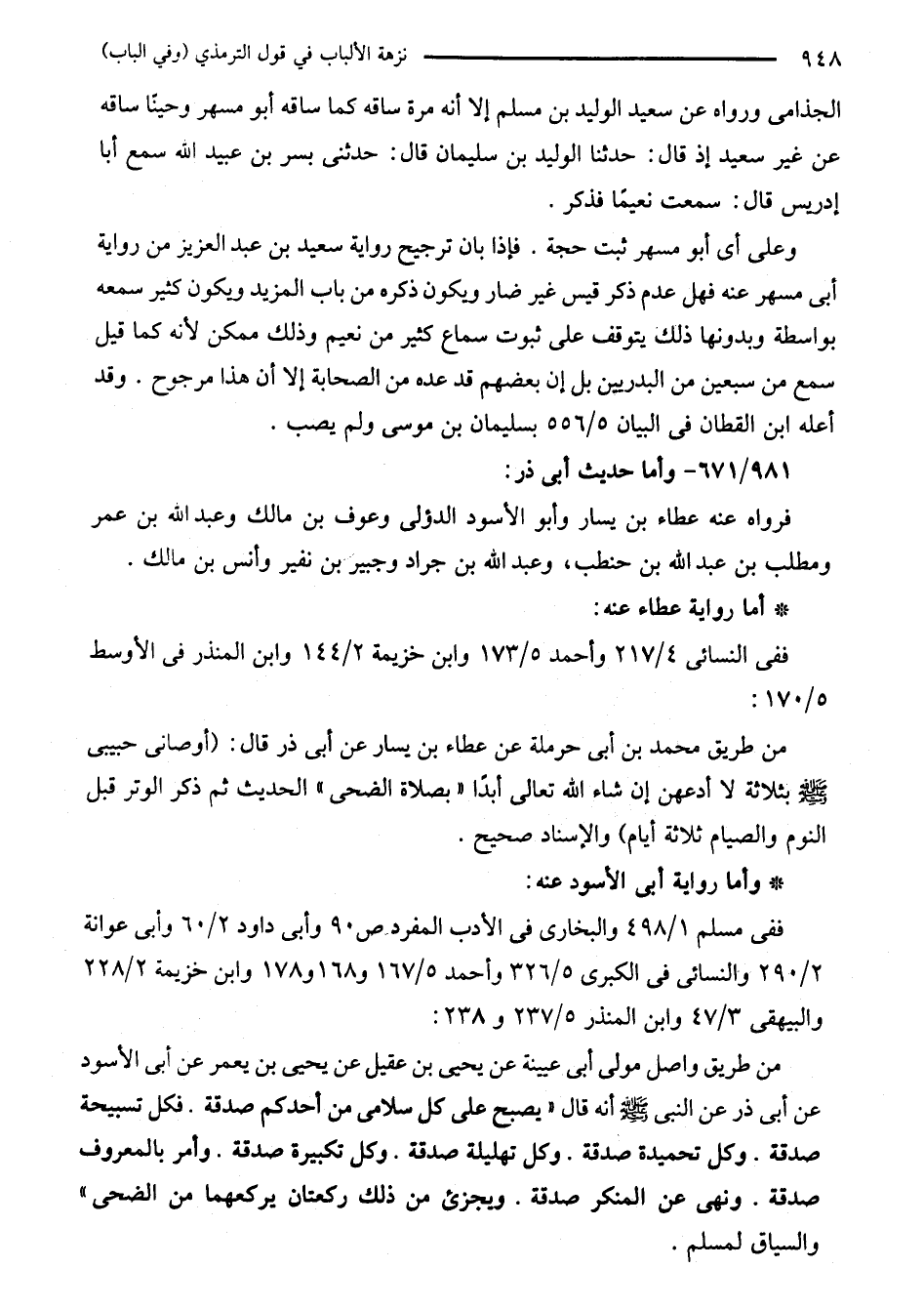 من طريق واصل مولى أبى عيينة عن يحيى بن عقيل عن يحيى بن يعمر عن أبى الأسود عن أبى ذر عن النبي - صلى الله عليه وسلم - أنه قال "يصبح على كل سلامى من أحدكم صدقة. فكل تسبيحة صدقة. وكل تحميدة صدقة. وكل تهليلة صدقة. وكل تكبيرة صدقة. وأمر بالمعروف صدقة. ونهى عن المنكر صدقة. ويجزئ من ذلك ركعتان يركعهما من الضحى" والسياق لمسلم.