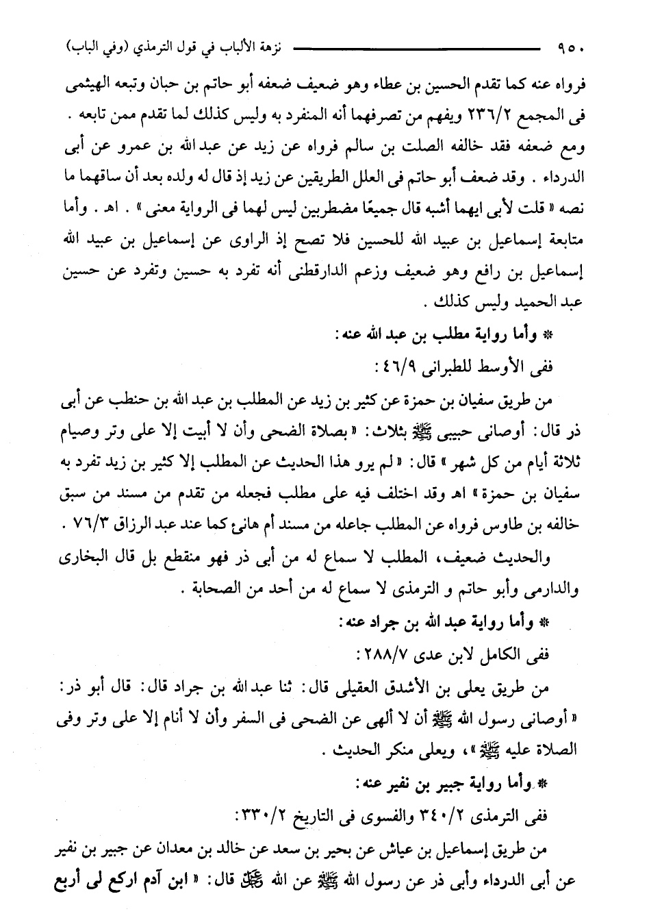 من طريق يعلى بن الأشدق العقيلى قال: ثنا عبد الله بن جراد قال: قال أبو ذر: "أوصانى رسول الله - صلى الله عليه وسلم - أن لا ألهى عن الضحى في السفر وأن لا أنام إلا على وتر وفى الصلاة عليه - صلى الله عليه وسلم -"، ويعلى منكر الحديث.