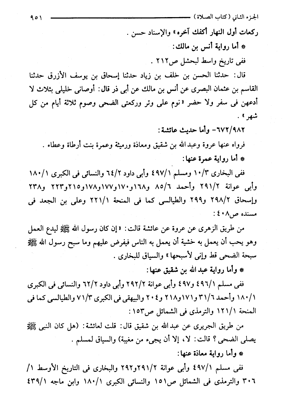 من طريق الزهرى عن عروة عن عائشة قالت: "إن كان رسول الله - صلى الله عليه وسلم - ليدع العمل وهو يحب أن يعمل به خشية أن يعمل به الناس فيفرض عليهم وما سبح رسول الله - صلى الله عليه وسلم - سبحة الضحى قط وإنى لأسبحها" والسياق للبخاري.