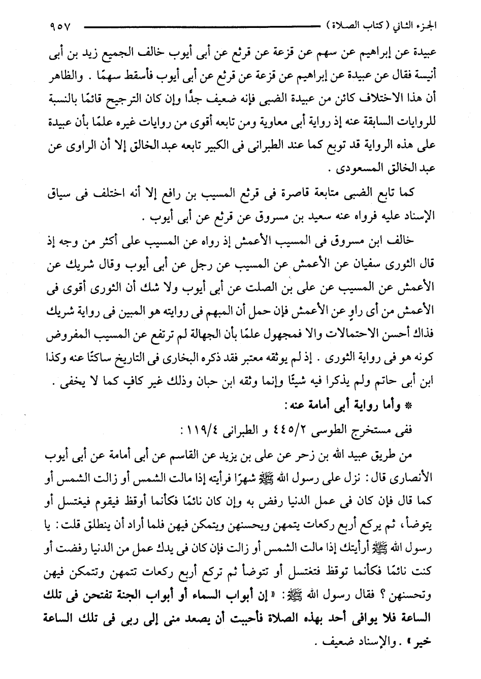 عبيدة عن إبراهيم عن سهم عن قزعة عن قرثع عن أبى أيوب خالف الجميع زيد بن أبى أنيسة فقال عن عبيدة عن إبراهيم عن قزعة عن قرثع عن أبى أيوب فأسقط سهمًا. والظاهر أن هذا الاختلاف كائن من عبيدة الضبى فإنه ضعيف جدًّا وإن كان الترجيح قائمًا بالنسبة للروايات السابقة عنه إذ رواية أبى معاوية ومن تابعه أقوى من روايات غيره علمًا بأن عبيدة على هذه الرواية قد توبع كما عند الطبراني في الكبير تابعه عبد الخالق إلا أن الراوى عن عبد الخالق المسعودي.