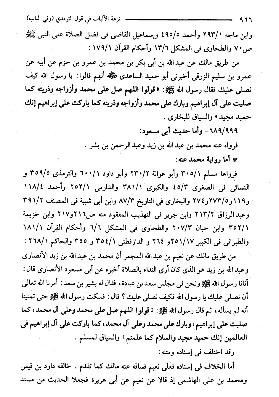 من طريق مالك عن نعيم بن عبد الله المجمر أن محمد بن عبد الله بن زيد الأنصاري وعبد الله بن زيد هو الذي كان أرى النداء بالصلاة أخبره عن أبى مسعود الأنصاري قال: أتانا رسول الله - صلى الله عليه وسلم - ونحن في مجلس سعد بن عبادة، فقال له بشير بن سعد: أمرنا الله تعالى أن نصلى عليك يا رسول الله فكيف نصلى عليك؟ قال: فسكت رسول الله - صلى الله عليه وسلم - حتى تمنينا أنه لم يسأله، ثم قال رسول الله - صلى الله عليه وسلم -: "قولوا اللهم صل على محمد وعلى آل محمد، كما صليت على إبراهيم، وبارك على محمد وعلى آل محمد، كما باركت على آل إبراهيم في العالمين إنك حميد مجيد والسلام كما علمتم" والسياق لمسلم.